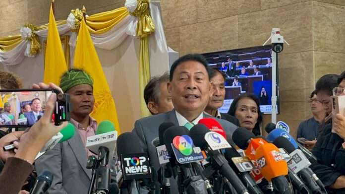 ที่อาคารรัฐสภา – นายสุรทิน พิจารณ์ สส.บัญชีรายชื่อ หัวหน้าพรรคประชาธิปไตยใหม่ ให้สัมภาษณ์ถึงกรณีที่ได้ดำเนินการเอาผิดนายภูมิธรรม เวชยชัย ปฏิบัติหน้าที่แทนนายกรัฐมนตรี ในความผิดตามมาตรา 112 จากการยื่นทูลเกล้าฯ พระราชกฤษฎีกา (พ.ร.ฎ.) ยุบสภา ถือเป็นการกระทำที่มิบังควร เนื่องจากไม่มีอำนาจ หน้าที่ หรือสิทธิที่สามารถทำได้
