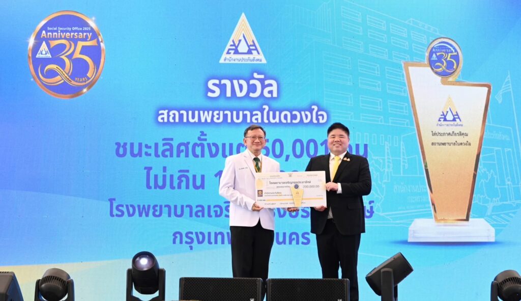 วันที่ 3 กันยายน 2568 นพ.พรเทพ แซ่เฮ้ง ผู้อำนวยการโรงพยาบาลเจริญกรุงประชารักษ์ สำนักการแพทย์ กรุงเทพมหานคร เข้ารับมอบรางวัลและโล่ประกาศเกียรติคุณสถานพยาบาลในดวงใจ ประจำปี 2568 รางวัลชนะเลิศ กลุ่มสถานพยาบาลที่มีผู้ประกันตนตั้งแต่ 50,001 คน ไม่เกิน 100,000 คน จาก นายพงศ์กวิน จึงรุ่งเรืองกิจ รัฐมนตรีว่าการกระทรวงแรงงาน ณ สำนักงานประกันสังคม จ.นนทบุรี โดยมีคณะผู้บริหารและบุคลากรของโรงพยาบาลร่วมแสดงความยินดี