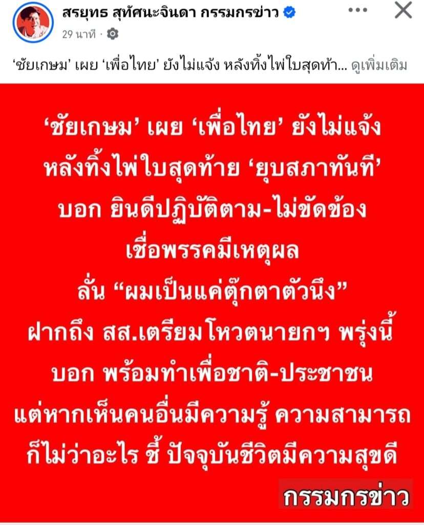 วันที่ 4 ก.ย. 2568 กรณีที่นายสรวงศ์ เทียนทอง รัฐมนตรีว่าการกระทรวงการท่องเที่ยวและกีฬา ในฐานะเลขาธิการพรรคเพื่อไทยยืนยันว่า พรรคเพื่อไทยจะเสนอชื่อ นายชัยเกษม นิติสิริ แคนดิเดตนายกรัฐมนตรี เป็นนายกรัฐมนตรี คนที่ 32 และประกาศทางเลือกสุดท้ายว่า “เลือกชัยเกษม ยุบสภาทันที”