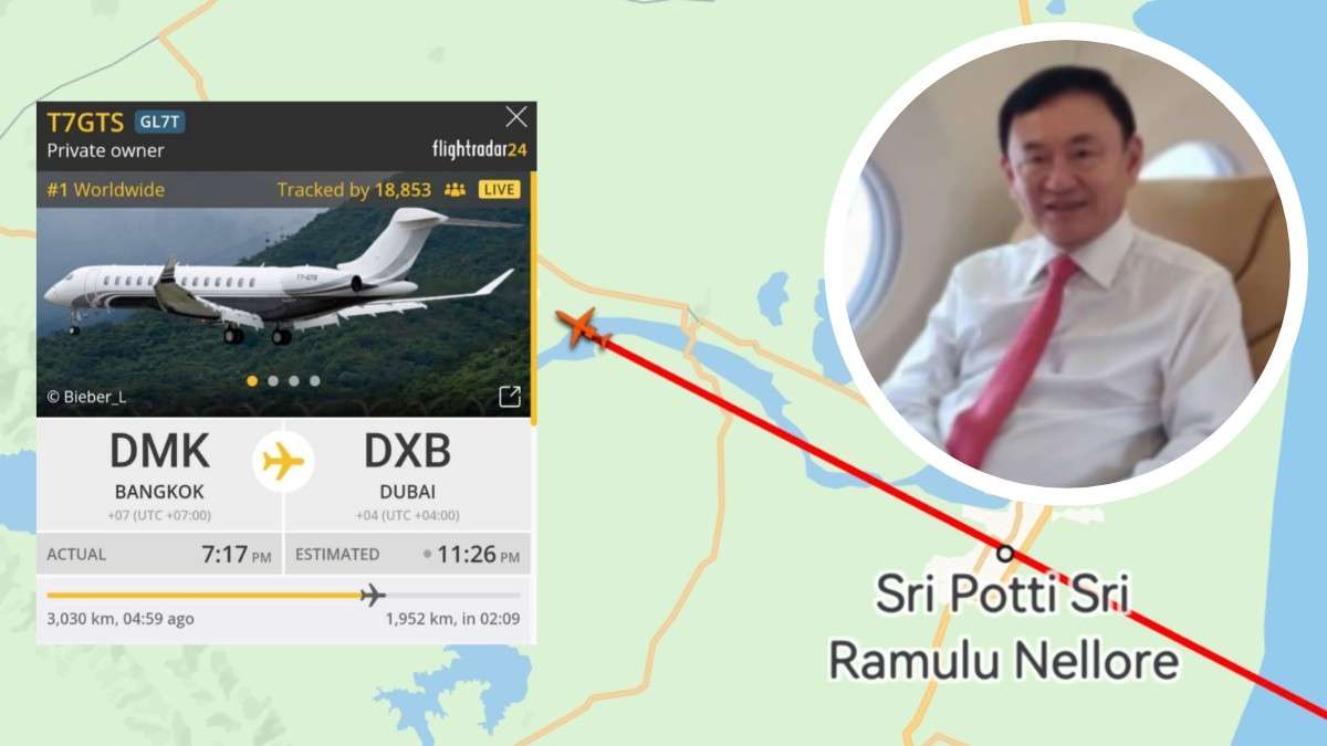 ความเคลื่อนไหวล่าสุดของเครื่องบินเจ็ทส่วนตัวที่นายทักษิณ ชินวัตร อดีตนายกรัฐมนตรี ใช้ในการเดินทาง ปรากฏข้อมูลจากเว็บไซต์ติดตามเที่ยวบิน Flightradar24 ระบุว่า ขณะนี้เครื่องบินได้บินพ้นน่านฟ้าอินเดียแล้ว โดยมีปลายทางไปยัง นครดูไบ สหรัฐอาหรับเอมิเรตส์
