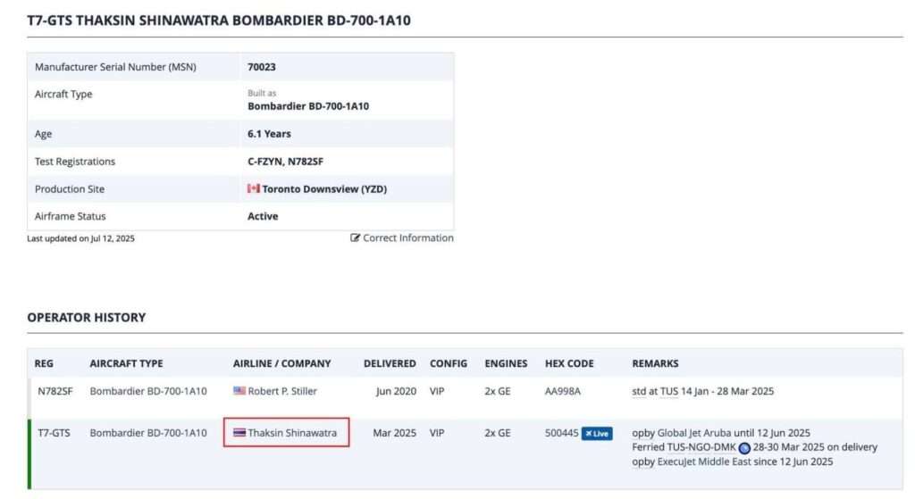 ย้อนกลับไปกว่า 2 ปีที่แล้ว วันที่ 22 สิงหาคม 2566 นายทักษิณ ชินวัตร เดินทางจากท่าอากาศยานเซเลตาร์ สิงคโปร์ ลงจอดท่าอากาศยานดอนเมืองด้วย Gulfstream G650ER ทะเบียนเดิม T7-GTS โดย Gulfstream G650ER ออกแบบและผลิตโดย Gulfstream Aerospace ซึ่งเป็นบริษัทลูกของ General Dynamics หนึ่งในบริษัทเทคโนโลยีด้านการทหารที่ใหญ่ที่สุดในโลก ถือเป็นเครื่องบินส่วนบุคคลที่มีสมรรถนะสูงรุ่นหนึ่งของโลก มีพิสัยการบินไกลถึง 14,000 กิโลเมตร มีความเร็วเดินทางสูงสุด 0.90 มัค หรือกว่า 1,100 กิโลเมตร/ชั่วโมง ที่ความสูงเดินทางสูงสุด 51,000 ฟุต โดย G650ER เคยทำสถิติบินจากสิงคโปร์ไปยังเมืองทูซอน รัฐแอริโซนา สหรัฐอเมริกา ใช้เวลา 15 ชั่วโมง 23 นาที ถือเป็นสถิติเที่ยวบินระยะทางไกลที่ใช้เวลาน้อยที่สุดของเครื่องบินส่วนบุคคล Gulfstream G650ER ติดตั้งเครื่องยนต์รุ่น BR725 ผลิตโดย Rolls-Royce มีแรงขับ 16,900 ปอนด์ สามารถทำการบินได้เร็วสูงสุดเกือบเท่าความเร็วเสียง มีความกว้างจากปลายปีกทั้ง 2 ข้างประมาณ 31 เมตร ซึ่งแคบกว่า Airbus A320 เพียง 4 เมตรเท่านั้นสรุปว่ามีการเปลี่ยนทะเบียน T7-GTS จากลำเดิมมาเป็นลำใหม่ Bombardier Global 7500 ที่ใช้บิน