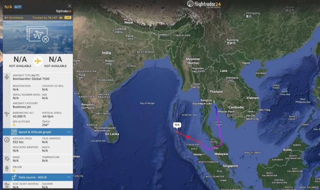 เมื่อวันที่ 5 ก.ย.2568 ผู้สื่อข่าวรายงานว่า จากกรณีมีข่าวใหญ่วันนี้กับการเดินทางออกจากประเทศไทยของอดีตนายกรัฐมนตรี ทักษิณ ชินวัตร ที่มีลับลวงพรางเล็กน้อย กับการมุ่งหน้าลงใต้ก่อนจะวกกลับไปอีกทางเหนือน่านฟ้ามาเลเซีย มุ่งหน้าทิศตะวันตกเฉียงเหนือ สำหรับเครื่องบินที่ทักษิณใช้ในวันนี้