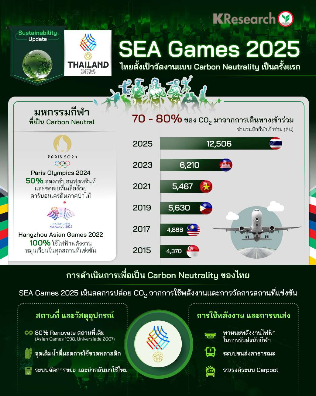 โดย 70 – 80% ของการปล่อย CO2 ในงานมหกรรมกีฬาจะจากการเดินทางของผู้เข้าร่วมงานและนักกีฬา ซึ่ง SEA Games 2025 ในครั้งนี้ คาดว่าจะมีจำนวนนักกีฬาเข้าร่วมมากที่สุดประมาณ 12,500 คน ซึ่งทำให้มีความจำเป็นที่จะต้องลดการปล่อย CO2 ในส่วนอื่นๆ ให้มากสุด และดำเนินการชดเชยการปล่อยคาร์บอนด้วยคาร์บอนเครดิตในภายหลังการจัดงาน