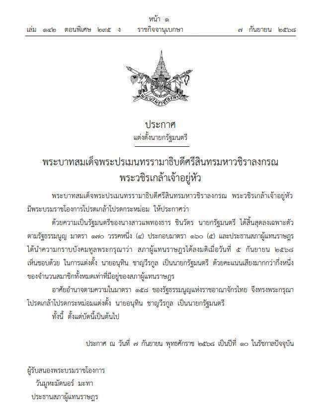พระบาทสมเด็จพระปรเมนทรรามาธิบดีศรีสินทรมหาวชิราลงกรณ พระวชิรเกล้าเจ้าอยู่หัว มีพระบรมราชโองการโปรดเกล้าโปรดกระหม่อม ให้ประกาศว่า ด้วยความเป็นรัฐมนตรีของ นางสาวแพทองธาร ชินวัตร นายกรัฐมนตรี ได้สิ้นสุดลงเฉพาะตัว ตามรัฐธรรมนูญ มาตรา 170 วรรคหนึ่ง (4) ประกอบมาตรา 160 (4) (5) และประธานสภาผู้แทนราษฎรได้นำความกราบบังคมทูลพระกรุณาว่าสภาผู้แทนราษฎรได้ลงมติเมื่อวันที่ 5 กันยายน 2568 เห็นชอบด้วย ในการแต่งตั้ง นายอนุทิน ชาญวีรกูล เป็นนายกรัฐมนตรี ด้วยคะแนนเสียงมากกว่ากึ่งหนึ่งของจำนวนสมาชิกทั้งหมดเท่าที่มีอยู่ของสภาผู้แทนราษฎรอาศัยอำนาจตามความในมาตรา 158 ของรัฐธรรมนูญแห่งราชอาณาจักรไทย จึงทรงพระกรุณาโปรดเกล้าโปรดกระหม่อมแต่งตั้ง นายอนุทิน ชาญวีรกูล เป็นนายกรัฐมนตรีทั้งนี้ ตั้งแต่บัดนี้เป็นต้นไป ประกาศ ณ วันที่ 7 กันยายน พุทธศักราช 2568 เป็นปีที่ 10 ในรัชกาลปัจจุบันผู้รับสนองพระบรมราชโองการ วันมูหะมัดนอร์ มะทา ประธานสภาผู้แทนราษฎร