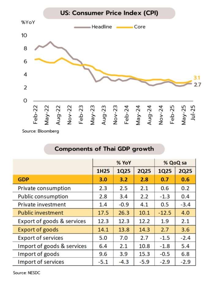 GDP ไตรมาส 2 ปี 2568 เติบโต 2.8% YoY และ 0.6% QoQ จากปัจจัยชั่วคราวของการเร่งส่งออกสินค้าล่วงหน้า สภาพัฒน์ฯ รายงานเศรษฐกิจไทยในไตรมาสสองของปีนี้ขยายตัว 2.8% ดีกว่าเล็กน้อยที่นักวิเคราะห์และวิจัยกรุงศรีคาดไว้ที่ 2.5% และ 2.7%YoY ตามลำดับ แต่ชะลอลงจาก 3.2% ใน 1Q68 โดย GDP ใน 2Q ได้แรงขับเคลื่อนจากการส่งออกสินค้าที่ยังเติบโตสูง แต่การส่งออกบริการชะลอลงตามจำนวนนักท่องเที่ยวต่างชาติ ด้านการบริโภคภาคเอกชนโตชะลอลงจากการใช้จ่ายบริการเป็นสำคัญ ส่วนการลงทุนภาคเอกชนกลับมาขยายตัวครั้งแรกในรอบ 5 ไตรมาส ซึ่งเป็นผลจากฐานต่ำปีก่อน ขณะที่การลงทุนและการบริโภคภาครัฐแม้เติบโตชะลอลงแต่ยังเป็นปัจจัยที่ช่วยหนุนเศรษฐกิจโดยรวม ล่าสุดสภาพัฒน์ฯ ปรับเพิ่มคาดการณ์ GDP ปีนี้ขยายตัวที่ 2.0% จากเดิมคาดที่ 1.8%