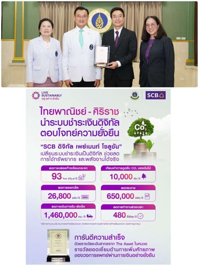ทั้งนี้ โรงพยาบาลศิริราชเริ่มเปลี่ยนมาใช้ SCB ดิจิทัล เพย์เมนท์ โซลูชัน ตั้งแต่ปี 2567 จนถึงเดือนเมษายน 2568 สามารถลดการใช้ทรัพยากรและพลังงานจากกระบวนการชำระเงินรูปแบบเดิมได้จริงเทียบเท่าการปล่อยก๊าซเรือนกระจก 93 ตันคาร์บอนต่อปี หรือ เทียบเท่ากับการดูดซับคาร์บอนไดออกไซด์ของต้นไม้จำนวน 10,000 ต้นต่อปี (โดยเฉลี่ยต้นไม้ 1 ต้นดูดซับ CO2 ได้ 9.5 kg/ปี) และส่งผลการเปลี่ยนแปลงที่เป็นรูปธรรม อาทิ ลดค่าใช้จ่ายที่เกิดจากการออกเช็ค26,800 ฉบับ ลดการใช้กระดาษตลอดกระบวนการชำระเงินถึง 650,000 แผ่น ลดพลังงานจากการเดินทางเพื่อรับ-ส่งเช็คประมาณปีละกว่า 1,400,000 กิโลเมตร ลดชั่วโมงการทำงานที่เกี่ยวข้องกับการจ่ายเช็คได้กว่า 480 ชั่วโมง ซึ่งนับเป็นผลพลอยได้ที่สามารถสร้างการเปลี่ยนแปลงทางด้านความยั่งยืนอย่างชัดเจนจากการยกระดับงานสู่ดิจิทัล