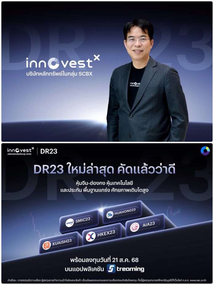 InnovestX เรือธงด้านการลงทุนภายใต้กลุ่มเอสซีบีเอกซ์ (SCBX Group) ตอกย้ำความเป็นผู้นำด้านการลงทุนต่างประเทศ เดินหน้าขยายโอกาสการลงทุนผ่าน ตราสารแสดงสิทธิในหลักทรัพย์ต่างประเทศ Depositary Receipt (DR) เปิดตัว DR23 ชุดใหม่ 5 ตัวรวดหลังจากที่ DR23 3 ตัวแรก HSHD23 CATL23 และ HSHD23 สามารถสร้างผลตอบแทนได้ดีและได้รับความนิยมจนมูลค่าตลาดเติบโตอย่างต่อเนื่อง โดย DR23 ชุดใหม่ครอบคลุมหุ้นจากตลาดหลักทรัพย์ฮ่องกงและจีน ได้แก่ 1) SMIC23 หุ้นผู้นำเซมิคอนดักเตอร์อันดับ 1 ในจีน ที่บริษัทเทคอย่าง Huawei, Qualcomm, Texas Instruments ใช้ 2) KUAISH23 แพลตฟอร์ม Social จาก Kuaishou ผู้ท้าชิง Tiktok ที่มีผู้ใช้งานกว่า 400 ล้านคนต่อวัน 3) HUAHONG23 ผู้ผลิตชิปพิเศษเฉพาะทาง ใช้ในอุตสาหกรรม EV, IoT และพลังงานสะอาด พร้อมรองรับทุกเทรนด์การเติบโตโลก 4) AIA23 ธุรกิจประกันใหญ่ที่สุดในเอเชีย ครอบคลุมประกันชีวิต สุขภาพ การลงทุน และอื่นๆ 5) HKEX23 ตลาดหลักทรัพย์ฮ่องกง ศูนย์กลางการลงทุนชั้นนำ เชื่อมจีนสู่ตลาดโลก ที่ Valuation น่าสนใจเป็นอันดับต้นๆ ของโลก โดย InnovestX มุ่งส่งเสริมให้นักลงทุนไทยเข้าถึงโอกาสการลงทุนในสินทรัพย์ที่มีศักยภาพและเดินหน้าคัดสรรสินทรัพย์น่าลงทุนจากทั่วโลกอย่างต่อเนื่อง พร้อมให้การเข้าถึงการลงทุนต่างประเทศง่าย สะดวก เสมือนการลงทุนในหุ้นไทย ซื้อขายเป็นเงินบาท ไร้กังวลภาษี ทั้งนี้ DR23 ทั้ง 5 ตัว พร้อมให้นักลงทุนซื้อขายได้แล้วตั้งแต่วันที่ 21 สิงหาคม 2568 เป็นต้นไป ผ่านแอป Streaming