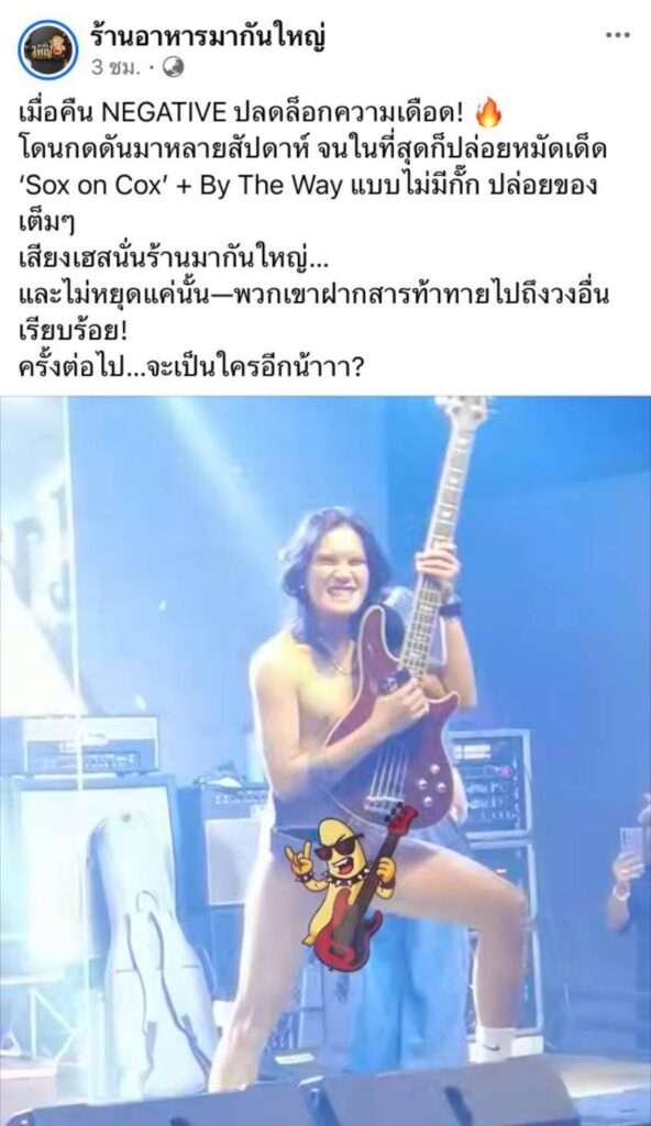 จากกรณีเพจ “ร้านอาหารมากันใหญ่” โพสต์คลิปการแสดงดนตรีของนักดนตรีที่มีการเปลื้องผ้า โชว์บนเวทีในร้าน พร้อมระบุข้อความว่า “เมื่อคืน NEGATIVE ปลดล็อกความเดือด! โดนกดดันมาหลายสัปดาห์ จนในที่สุดก็ปล่อยหมัดเด็ด ‘Sox on Cox’ + By The Way แบบไม่มีกั๊ก ปล่อยของเต็ม ๆ เสียงเฮสนั่นร้านมากันใหญ่…และไม่หยุดแค่นั้น–พวกเขาฝากสารท้าทายไปถึงวงอื่นเรียบร้อย! ครั้งต่อไป… จะเป็นใครอีกน้าาา?”