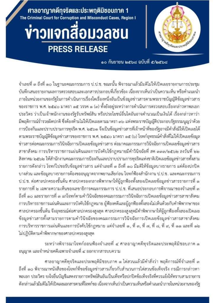 วันที่ 10 กันยายน 2568 ที่ศาลอาญาคดีทุจริตและประพฤติมิชอบ ภาค 1 ศาลอ่านคำสั่งในคดีหมายเลขดำที่ อท95/2567 ระหว่าง นายวีระ สมความคิด ประธานเครือข่ายประชาชนต้านคอร์รัปชัน โจทก์ นายนิวัติไชย เกษมมงคล อดีตคณะกรรมการป้องกันและปราบปรามการทุจริตแห่งชาติ (ป.ป.ช.) จำเลยที่ 1 และพวกรวม 12 คน กรณีโจทก์ขอให้เปิดเผยข้อมูลในสำนวนการไต่สวนข้อเท็จจริงเกี่ยวกับการจงใจแสดงรายการทรัพย์สินอันเป็นเท็จ หรือปกปิดข้อเท็จจริงที่ควรแจ้งให้ทราบ กรณีกล่าวหา พล.อ.ประวิตร วงษ์สุวรรณ อดีตรองนายกฯ เมื่อครั้งดำรงตำแหน่ง ไม่แสดงว่า มีนาฬิกาข้อมือมือราคาแพง จำนวนมาก และแหวนประดับ มีค่าหลายรายการ