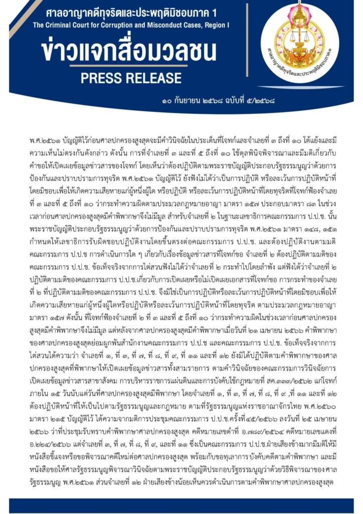 ดังนั้น ที่โจทก์ฟ้องจำเลยที่ 2 ที่ 3 และที่ 5 ถึงที่ 10 ว่ากระทำความผิดในช่วงเวลาก่อนศาลปกครอง สูงสุดมีคำพิพากษาจึงไม่มีมูล แต่หลังจากศาลปกครองสูงสุดมีคำพิพากษาเมื่อวันที่ 21 เมษายน 2566 คำพิพากษา ของศาลปกครองสูงสุดย่อมผูกพันสำนักงานคณะกรรมการ ป.ป.ช และคณะกรรมการ ป.ป.ช. ข้อเท็จจริงจากการ ไต่สวนได้ความว่า จำเลยที่ 1, ที่ 3, ที่ 7, ที่ 8, ที่ 9, ที่ 11 และที่ 12 ยังมิได้ปฏิบัติตามคำพิพากษาของศาล ปกครองสูงสุดที่พิพากษาให้เปิดเผยข้อมูลข่าวสารทั้งสามรายการ ตามคำวินิจฉัยของคณะกรรมการวินิจฉัยการ เปิดเผยข้อมูลข่าวสารสาขาสังคม การบริหารราชการแผ่นดินและการบังคับใช้กฎหมายที่ สค.333/2562 แก่โจทก์ ภายใน 15 วันนับแต่วันที่ศาลปกครองสูงสุดมีพิพากษา โดยจำเลยที่ 1, ที่ 3, ที่ 7, ที่ 8, ที่ 9, ที่ 11 และที่ 12ต้องปฏิบัติหน้าที่ให้เป็นไปตามรัฐธรรมนูญและกฎหมาย ตามที่รัฐธรรมนูญแห่งราชอาณาจักรไทย พ.ศ. 2560 มาตรา 125 บัญญัติไว้ ได้ความจากมติการประชุมคณะกรรมการ ป.ป.ช.ครั้งที่ 45/2566 ลงวันที่ 25 เมษายน 2566 ว่าที่ประชุมรับทราบคำพิพากษาศาลปกครองสูงสุด คดีหมายเลขดำที่ อ.798/2564 คดีหมายเลขแดงที่อ.224/2566 แต่จำเลยที่3, ที่ 7, ที่ 8, ที่ 9, ที่ 11 ซึ่งเป็นคณะกรรมการ ป.ป.ช.ฝ่ายเสียงช้างมากมีมตีให้มี หนังสือชี้แจงหรือขอพิจารณาคดีใหม่ต่อศาลปกครองสูงสุด พร้อมกับขอทเลาการบังคับคดีตามคำพิพากษา และมีหนังสือขอให้ศาลรัฐธรรมนูญพิจารณาวินิจฉัยตามพระราชบัญญัติประกอบรัฐธรรมนูญว่าด้วยวิธีพิจารณาของศาลรัฐธรรมนูญ พ.ศ.2561 ส่วนจำเลยที่ 12 ฝ่ายเสียงข้างน้อยเห็นควรดำเนินการตามคำพิพากษาศาลปกครองสูงสุด