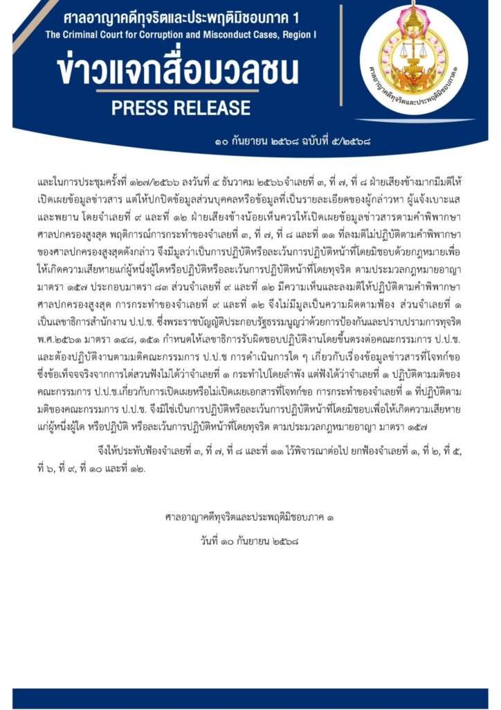การกระทำของจำเลยที่ 1 จึงมิใช่เป็นการปฏิบัติหรือละเว้นการปฏิบัติหน้าที่โดยมิชอบเพื่อให้เกิดความเสียหายแก่ผู้หนึ่งผู้ใด หรือปฏิบัติ หรือละเว้นการปฏิบัติหน้าที่โดยทุจริต ตามประมวลกฎหมายอาญา มาตรา 157 จึงให้ประทับฟ้องจำเลยที่ 3,7,8,11 ไว้พิจารณา ยกฟ้องจำเลยที่ 1,2,5,6,9,10,12 โดยศาลนัดพร้อมเพื่อสอบคำให้การและกำหนดวันนัดพิจารณา ในวันที่ 28 ตุลาคม นี้