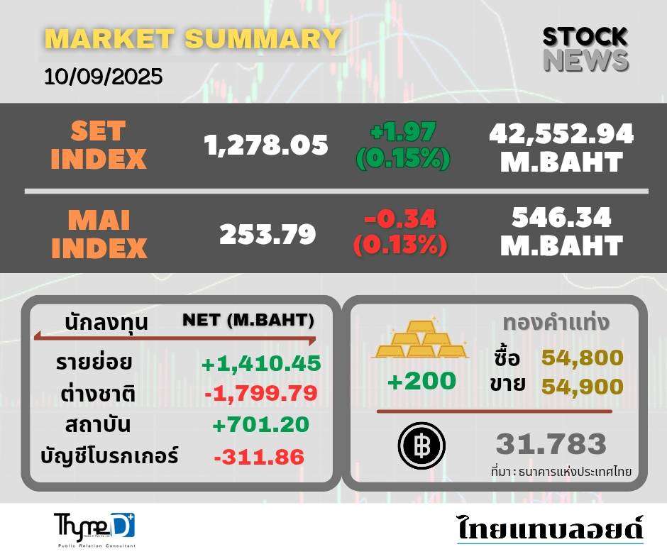 SET ปิดวันนี้ที่ 1,278.05 จุด เพิ่มขึ้น 1.97 จุด (+0.15%) มูลค่าซื้อขาย 42,552.94 ล้านบาท