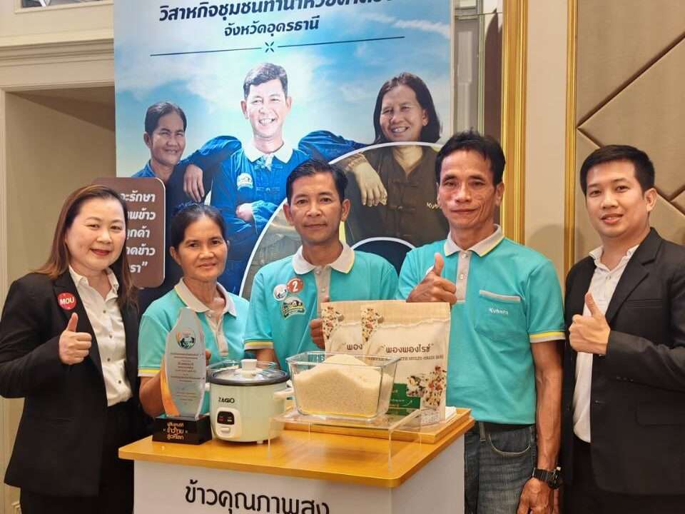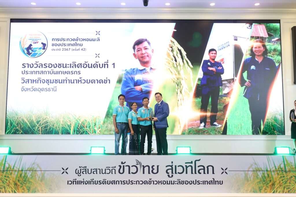 วิสาหกิจชุมชนทำนาห้วยตาดข่า จังหวัดอุดรธานี คว้ารางวัลรองชนะเลิศอันดับที่ 1 ประเภทสถาบันเกษตรกร รับโล่เกียรติยศ พร้อมเงินรางวัล 100,000 บาท ในการประกวด Thai Hom Mali Rice Awards 2024 เวทีแห่งเกียรติยศการประกวดข้าวหอมมะลิของประเทศไทยเพื่อยกย่องและเชิดชูเกษตรกรและสถาบันเกษตรที่มีความมุ่งมั่นในการรักษาและพัฒนาคุณภาพข้าวหอมมะลิไทยให้คงความมีอัตลักษณ์เฉพาะตัว และมีความอร่อยจน เป็นที่ยอมรับ ในระดับสากลตอบโจทย์ผู้บริโภคที่ต้องการข้าวคุณภาพสูง พร้อมเชื่อมโยงการตลาด สร้างมูลค่าเพิ่ม ส่งเสริมการกระจายรายได้สู่ชุมชนและเปิดช่องทางจำหน่ายอย่างยั่งยืนให้กับชาวนาไทย โดยมี นายฉัตรเชาวสิโรตม์ ยอดคีรี ประธานกลุ่มวิสาหกิจชุมชนทำนาห้วยตาดข่า จังหวัดอุดรธานี นำทีมสมาชิกเกษตรกร เข้ารับรางวัลจาก นายจตุพร บุรุษพัฒน์ รัฐมนตรีว่าการกระทรวงพาณิชย์ ประธานในพิธี