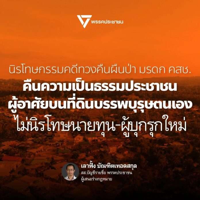 สส.บัญชีรายชื่อกล่าวว่าร่าง พ.ร.บ.นิรโทษกรรมฯ ฉบับนี้จึงมีความประสงค์ในการคืนความเป็นธรรมให้แก่ราษฎรที่ได้อยู่อาศัยและทำกินมาก่อน และถูกดำเนินคดีอย่างไม่เป็นธรรม โดยต้องล้างมลทินให้ และปลดล็อกให้ประชาชนสามารถนำที่ดินเข้าสู่กระบวนการรับรองคุมครองสิทธิ์ตามปกติ คนที่สามารถพิสูจน์สิทธิ์ตามประมวลกฎหมายที่ดินได้ก็เข้าสู่กระบวนการพิสูจน์สิทธิ์ ส่วนพื้นที่ที่อยู่ในเงื่อนไขได้รับการคุ้มครอง เช่น เข้าสู่กระบวนการ คทช. ก็ให้มีสิทธิเข้าสู่กระบวนการ คทช.