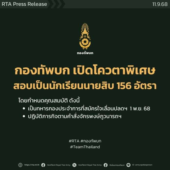 กองทัพบก, 11 กันยายน ทีมโฆษกกองทัพบก แจ้งข่าวดีว่ากองทัพบกเล็งเห็นความสำคัญในการปฏิบัติหน้าที่ของทหารกองประจำการโดยเฉพาะผู้ที่ปฏิบัติราชการสนามตามแนวชายแดนที่มีการสู้รบ ซึ่งต้องปฏิบัติหน้าที่ด้วยความกล้าหาญ เสียสละ และอุทิศตนเพื่อปกป้องรักษาอธิปไตยของชาติ พลเอก พนา แคล้วปลอดทุกข์ ผู้บัญชาการทหารบก ได้อนุมัติให้เปิดโควต้าพิเศษในการสอบเข้ารับราชการเป็นนักเรียนนายสิบทหารบก ประจำปี 2569 จำนวน 156 อัตรา ให้แก่ทหารกองประจำการที่ขอเลื่อนกำหนดเวลาปลดจากกองประจำการ ณ วันที่ 1 พฤศจิกายน 2568 และปฏิบัติภารกิจป้องกันอธิปไตยในพื้นที่ชายแดนไทย – กัมพูชา ตามคำสั่งจักรพงษ์ภูวนารถฯ ของกองทัพบก