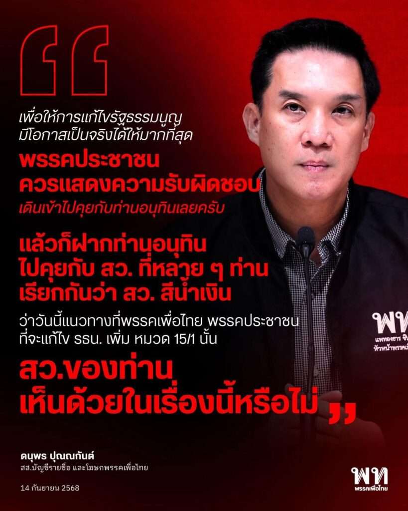 นายดนุพร ปุณณกันต์ สส.บัญชีรายชื่อ และโฆษกพรรคเพื่อไทย แถลงถึงการเดินหน้าแก้ไขรัฐธรรมนูญ 2560 หลังศาลรัฐธรรมนูญมีคำวินิจฉัยกรณีกระบวนการขั้นตอนการทำประชามติเพื่อเปิดทางการจัดทำรัฐธรรมนูญฉบับใหม่ว่า หลังจากศาลรัฐธรรมนูญมีคำวินิจฉัยที่ออกมา เมื่อวันที่ 10 กันยายน 2568 หลายฝ่ายยังคงมีข้อกังวล เพราะไม่เพียงแต่เป็นการวินิจฉัยถึงขั้นตอนกระบวนการจัดทำประชามติตามที่สมาชิกรัฐสภาได้ยื่นคำร้องไปเท่านั้น แต่ยังมีการวินิจฉัยเพิ่มเติมถึงที่มาของสมาชิกสภาร่างรัฐธรรมนูญ (สสร.) ด้วยว่าไม่สามารถได้มาจากการเลือกตั้งโดยตรงของพี่น้องประชาชนได้ อย่างไรก็ตามแม้คำวินิจฉัยดังกล่าว จะไม่ใช่ประเด็นที่อยู่ในคำร้องให้ศาลรัฐธรรมนูญวินิจฉัย แต่คำวินิจฉัยดังกล่าวย่อมมีผลผูกพันทุกองค์กร