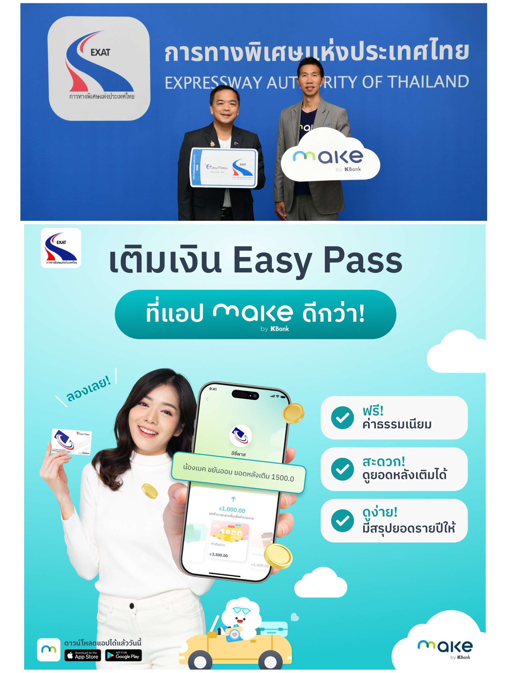 กสิกร บิซิเนส-เทคโนโลยี กรุ๊ป (KBTG) ร่วมกับ การทางพิเศษแห่งประเทศไทย (กทพ. หรือ EXAT) เปิดให้บริการเติมเงินบัตร Easy Pass ผ่านแอปพลิเคชัน MAKE by KBank ยกระดับประสบการณ์ให้แก่ผู้ใช้บริการทางพิเศษ เพิ่มความสะดวก รวดเร็ว สามารถเติมเงินได้ทุกที่ ทุกเวลา และปลอดค่าธรรมเนียม ชู 3 จุดเด่น ที่เหนือแอปธนาคารทั่วไป ทั้งแจ้งยอดคงเหลือก่อนเติมเงิน สรุปยอดเงินที่เติมไปแล้วแบบรายปี และบันทึกการใช้งานอัตโนมัติ นับเป็นอีกหนึ่งก้าวสำคัญของความร่วมมือระหว่างภาครัฐและเอกชนในการนำเทคโนโลยีมาพัฒนาระบบบริการสาธารณะให้ทันสมัยและเข้าถึงผู้ใช้งานได้มากยิ่งขึ้น โดยสามารถเริ่มใช้งานได้แล้ว เพิ่มทางเลือกการเติมเงินให้แก่ผู้ใช้บัตร Easy Pass ที่มีกว่า 2.8 ล้านบัตร