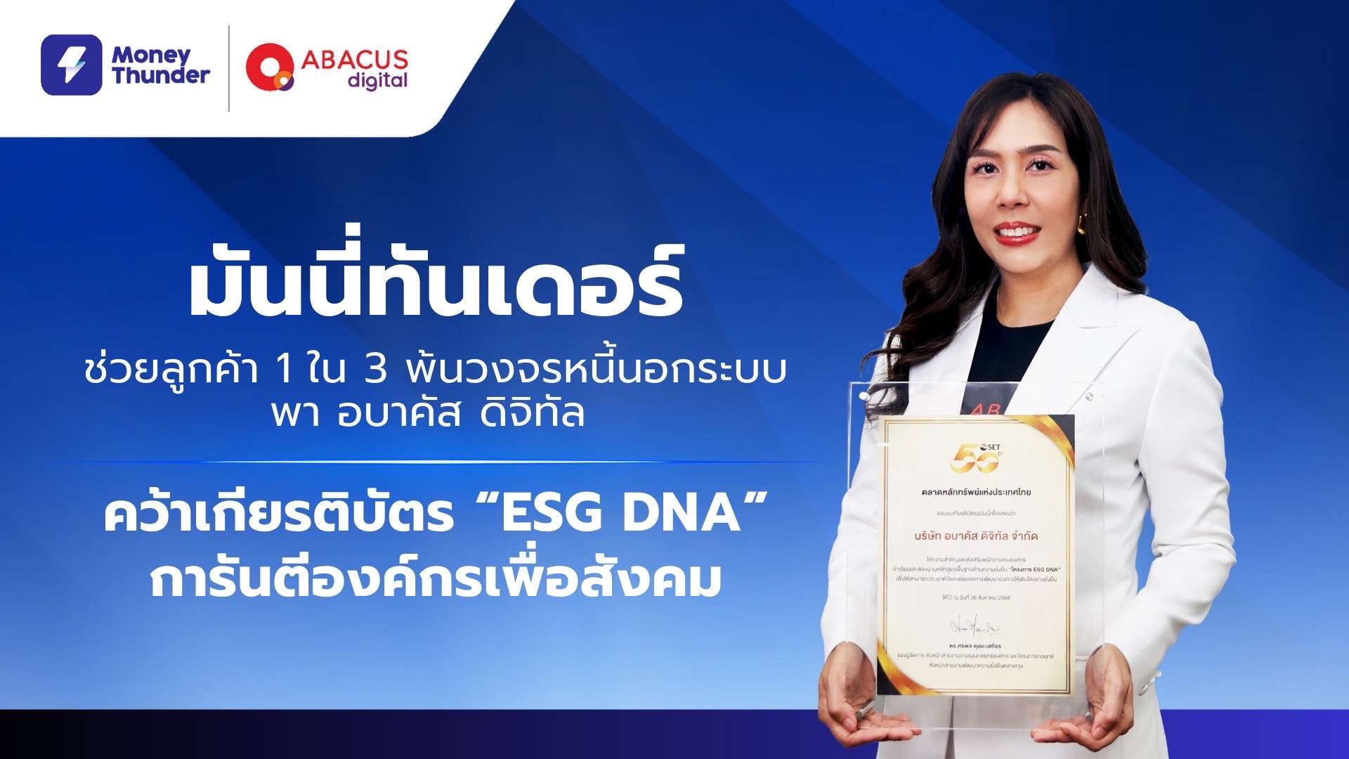 บริษัท อบาคัส ดิจิทัล จำกัด ผู้พัฒนาแอปพลิเคชันสินเชื่อออนไลน์ “มันนี่ทันเดอร์” (MoneyThunder) รับมอบเกียรติบัตร “โครงการ ESG DNA ชุดความรู้ด้านความยั่งยืน” จากตลาดหลักทรัพย์แห่งประเทศไทย ในฐานะองค์กรที่นำแนวคิดด้านสิ่งแวดล้อม (Environmental), สังคม (Social) และธรรมาภิบาล (Governance) หรือ ESG มาใช้เป็นแนวทางหลักในการดำเนินธุรกิจ เพื่อสร้างการเติบโตที่มั่นคงและยั่งยืน