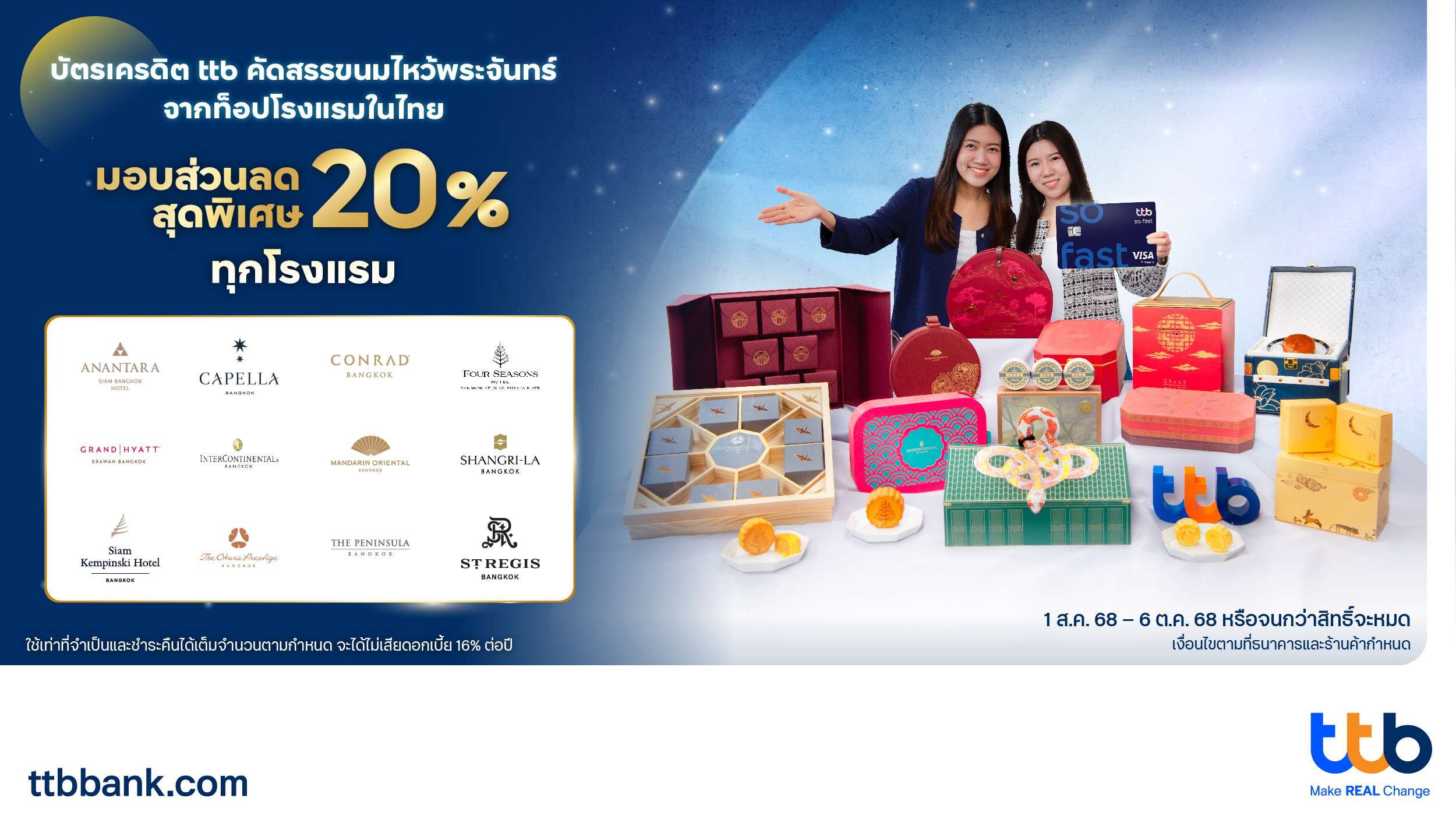 ทีเอ็มบีธนชาต หรือ ทีทีบี ร่วมฉลองเทศกาลไหว้พระจันทร์ส่งมอบความสุข ความอร่อย โดยคัดสรรขนมไหว้พระจันทร์สุดพรีเมียม จาก 12 โรงแรมชั้นนำของประเทศไทย พร้อมรับส่วนลด 20% เฉพาะผู้ถือบัตรเครดิต ttb บัตรเครดิต ttb Global House และบัตรเครดิต ttb Disney แบบไม่มีขั้นต่ำ จาก 12 โรงแรมชั้นนำในประเทศไทย ได้แก่ Mandarin Oriental Bangkok, Grand Hyatt Erawan Bangkok, InterContinental Bangkok, Shangri-La Bangkok, The Peninsula Bangkok, Anantara Siam Bangkok Hotel, Siam Kempinski Hotel Bangkok, The Okura Prestige Bangkok, Capella Bangkok, Conrad Bangkok, Four Seasons Hotel Bangkok at Chao Phraya River และ The St. Regis Bangkok ตั้งแต่วันที่ 1 สิงหาคม – 6 ตุลาคม 2568 ศึกษารายละเอียดเพิ่มเติมของโปรโมชัน ได้ที่ https://www.ttbbank.com/th/promotion/credit-card/dining/mooncake-aug25