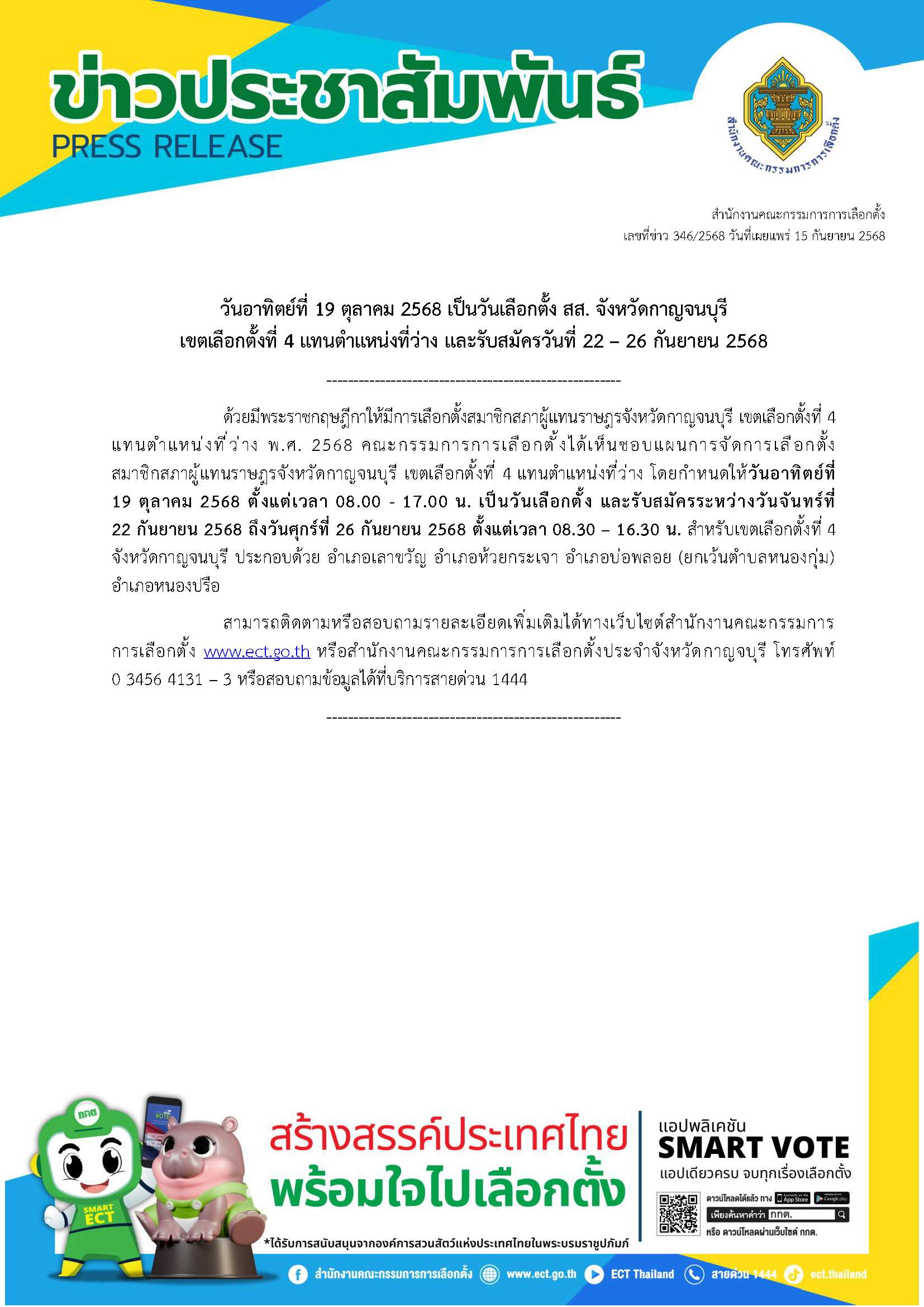 สำนักงานคณะกรรมการการเลือกตั้ง ออกเอกสารระบุว่า ด้วยมีพระราชกฤษฎีกาให้มีการเลือกตั้งสมาชิกสภาผู้แทนราษฎรจังหวัดกาญจนบุรี เขตเลือกตั้งที่ 4 แทนตำแหน่งที่ว่าง พ.ศ. 2568 คณะกรรมการการเลือกตั้งได้เห็นชอบแผนการจัดการเลือกตั้งสมาชิกสภาผู้แทนราษฎรจังหวัดกาญจนบุรี เขตเลือกตั้งที่ 4 แทนตำแหน่งที่ว่าง