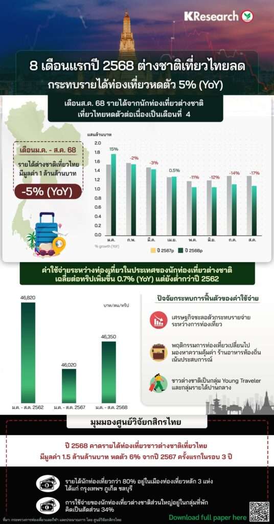กรุงเทพฯ วันที่ 16 ก.ย. ศูนย์วิจัยกสิกรไทย พบ 8 เดือนแรกปี 2568 รายได้ต่างชาติเที่ยวไทยมีมูลค่า 1.0 ล้านล้านบาท หดตัว 5% (YoY) ในช่วงที่เหลือของปี 2568 หลายปัจจัยลบกระทบการฟื้นตัวของรายได้ ทำให้ทั้งปี 2568 คาดรายได้ท่องเที่ยวชาวต่างชาติเที่ยวไทยมีมูลค่า 1.5 ล้านล้านบาท หดตัว 6% จากปี 2567 ครั้งแรกในรอบ 3 ปี