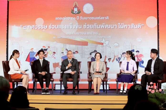กรุงเทพฯ, วันที่ 16 กันยายน – นายอนุกูล ปีดแก้ว ปลัดกระทรวงการพัฒนาสังคมและความมั่นคงของมนุษย์ (ปลัด พม.) เป็นประธานแถลงข่าวการจัดงาน 40 ปี วันเยาวชนแห่งชาติ ประจำปี 2568 ภายใต้แนวคิด “4 ทศวรรษ ร่วมแรงแข็งขัน ช่วยกัน พัฒนา ใฝ่หาสันติ” เพื่อส่งเสริมศักยภาพเด็กและเยาวชนทั่วประเทศ โดยมีนางอภิญญา ชมภูมาศ อธิบดีกรมกิจการเด็กและเยาวชน (ดย.) นายชินท์ณภัทร โต๊ะเส็น ประธานสภาเด็กและเยาวชนแห่งประเทศไทย พร้อมด้วยเด็กและเยาวชนดีเด่นแห่งชาติ ประจำปี 2568 ได้แก่ นางสาวปัณฑ์ดา วิจิตรทัศนา (ด้านพัฒนาสังคม) และนายทัศนพล อินทรภูวศักดิ์ (ด้านการศึกษา กีฬา นันทนาการ) ร่วมแถลงข่าว ที่ กระทรวง พม.