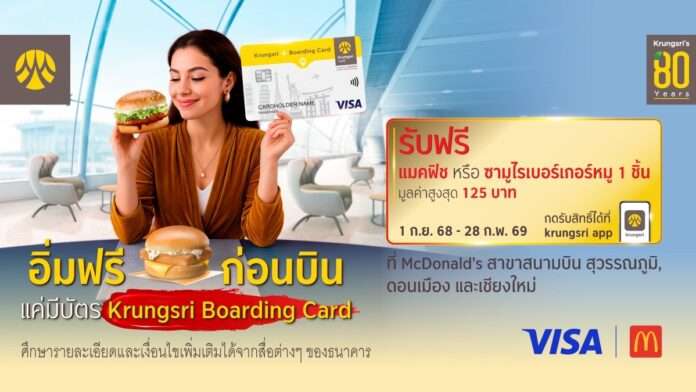 กรุงศรี (ธนาคารกรุงศรีอยุธยา จำกัด (มหาชน)) มอบสิทธิพิเศษสำหรับผู้ถือบัตร Krungsri Boarding Card ที่สมัครและเปิดใช้บัตร (Activate card) ก่อนวันที่ 1 กันยายน 2568 และยังคงสถานะการใช้งานอยู่ รับฟรี แมคฟิช หรือ ซามูไรเบอร์เกอร์หมู 1 ชิ้น มูลค่าสูงสุด 125 บาท ที่ McDonald’s สาขาสนามบิน สุวรรณภูมิ, ดอนเมือง และเชียงใหม่ โดยสามารถกดรับสิทธิ์ผ่าน krungsri app เมนูสิทธิประโยชน์ ภายในระยะเวลาที่กำหนด พร้อมแสดงบัตร Krungsri Boarding Card เพื่อรับสิทธิ์กับพนักงานของ McDonald’s ตั้งแต่วันที่ 1 กันยายน 2568 – 28 กุมภาพันธ์ 2569