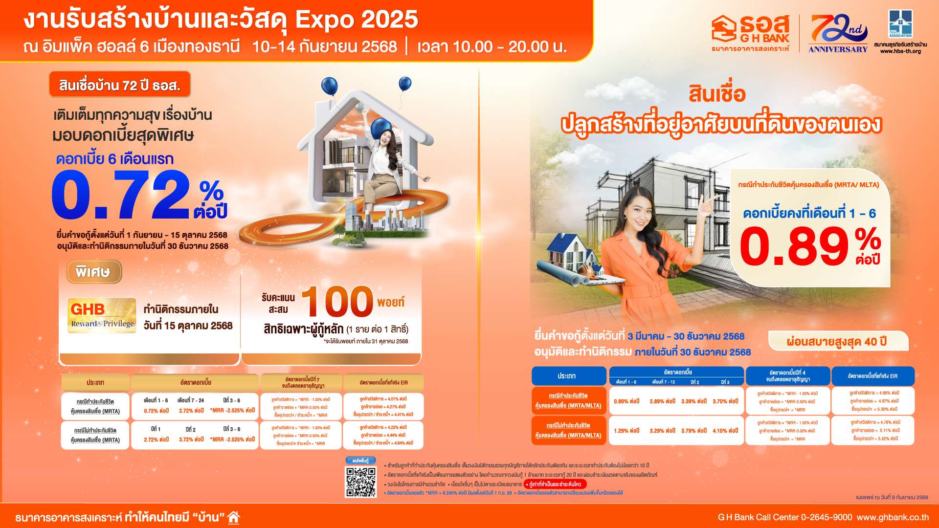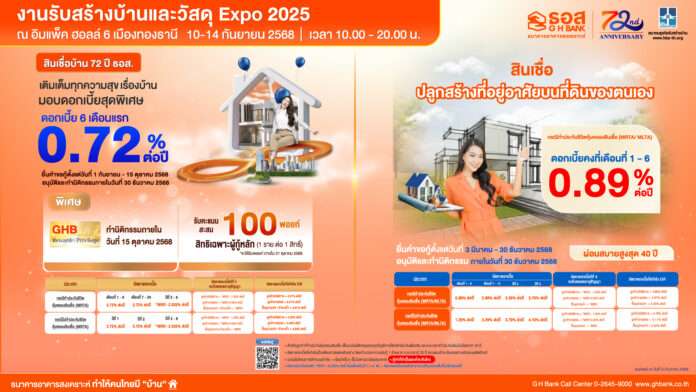 (1) สินเชื่อบ้าน 72 ปี ธอส. : ครอบคลุมทุกวัตถุประสงค์การกู้ อัตราดอกเบี้ยเริ่มต้นเพียง 0.72% ต่อปี นาน 6 เดือนแรก,เดือนที่ 7 – 24 เท่ากับ 2.72% ต่อปี, ปีที่ 3 – 6 เท่ากับ MRR-2.525% ต่อปี (3.72% ต่อปี) เฉลี่ย 3 ปีแรก เท่ากับ 2.72% ต่อปี ปีที่ 7 จนถึงตลอดอายุสัญญา กรณีลูกค้าสวัสดิการ เท่ากับ MRR-1.00% ต่อปี กรณีลูกค้ารายย่อย เท่ากับ MRR-0.50% ต่อปี และกรณีซื้ออุปกรณ์ฯ / ชำระหนี้ฯ เท่ากับ MRR (อัตราดอกเบี้ย MRR ของ ธอส. ปัจจุบันเท่ากับ 6.245% ต่อปี) ผ่อนชำระนานสูงสุด 40 ปี กรณีกู้ 1 ล้านบาท ผ่อนชำระเริ่มต้นเพียง 2,700 บาท/เดือน เท่านั้น ผู้ที่สนใจสามารถยื่นขอสินเชื่อได้ตั้งแต่วันนี้ถึงวันที่ 15 ตุลาคม 2568 อนุมัติและทำนิติกรรมภายในวันที่ 30 ธันวาคม 2568 พิเศษ! ลูกค้าที่ทำนิติกรรมภายในวันที่ 15ตุลาคม 2568 ผู้กู้หลักจะได้รับคะแนนสะสมใน GHB Reward จำนวน 100พอยท์ (ลูกค้าจะได้รับพอยท์ภายในวันที่ 30 ตุลาคม 2568) เพื่อนำไปแลกรับสิทธิ์สินค้าและบริการจากร้านค้าที่ร่วมรายการ