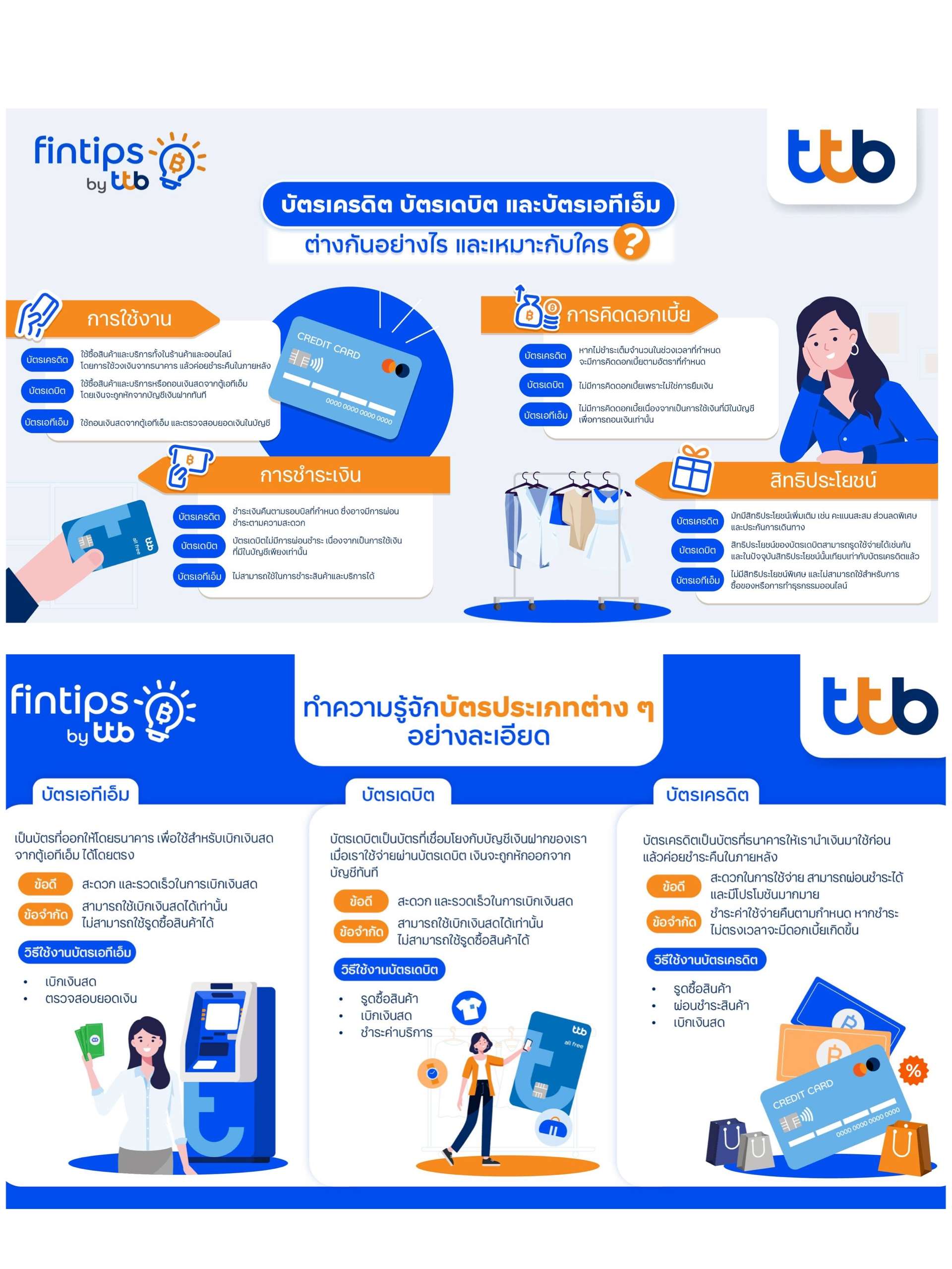 ในยุคสังคมไร้เงินสด ผู้คนต่างพากันใช้บัตรเดบิต บัตรเอทีเอ็ม และบัตรเครดิต เพื่อความสะดวกสบายในการทำธุรกรรม ทั้งการเบิกเงินสดหรือการโอนเงินเพื่อซื้อสิ่งของที่จำเป็น เพื่อใช้แทนการพกเงินสดจำนวนมาก แต่การมีบัตรหลายประเภทก็ทำให้หลายคนเกิดความสับสนว่า บัตรเดบิตกับบัตรเอทีเอ็มต่างกันอย่างไร หรือบัตรเดบิตกับบัตรเครดิต ต่างกันอย่างไร? วันนี้ fintips by ttb #เรื่องเงินที่รู้จริงแบบเพื่อนที่รู้ใจ จึงชวนมาทำความรู้จักให้ชัด ว่าแต่ละบัตรมีการใช้งานอย่างไรให้ถูกประเภทและคุ้มค่า
