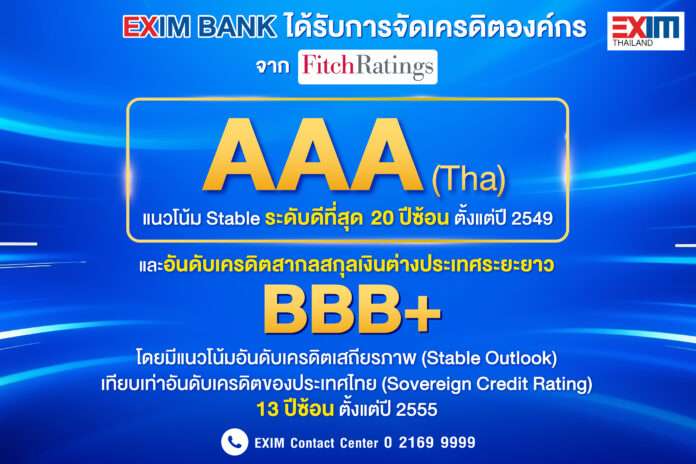 EXIM BANK โชว์สถานะทางการเงินแข็งแกร่ง คงอันดับเครดิตสูงสุดในประเทศ ระดับ AAA(tha) ต่อเนื่องเป็นปีที่ 20