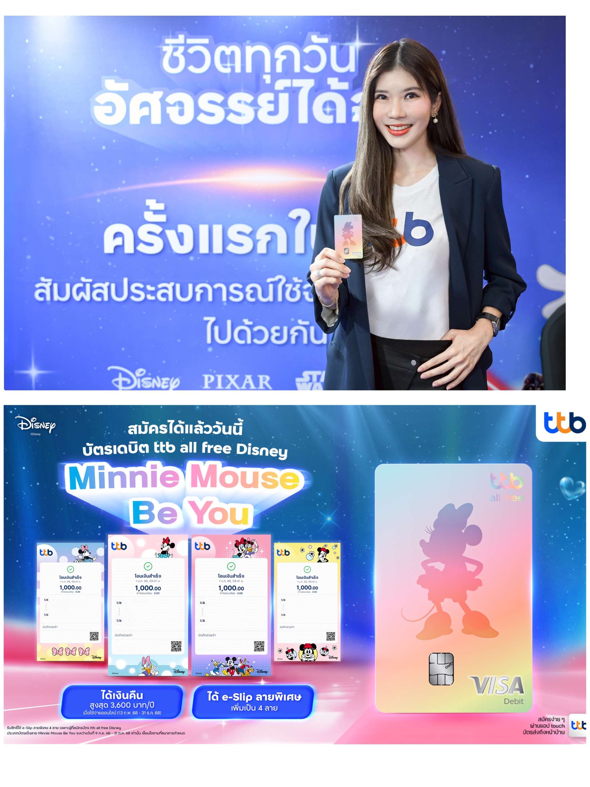บัตรเดบิต ทีทีบี ออลล์ฟรี ดิสนีย์ ลาย “มินนี่ เมาส์ บี ยู” พร้อมให้ลูกค้าสมัครได้ด้วยตนเองทางแอป ทีทีบี ทัช เว็บไซต์ทีทีบี หรือที่ทีทีบีทุกสาขา ตั้งแต่วันที่ 9กันยายน 2568 นี้เป็นต้นไป บัตรเดบิต ทีทีบี ออลล์ฟรี ดิสนีย์ บัตรเดียวที่ตอบโจทย์ทุกไลฟ์สไตล์ให้คุณใช้ชีวิตทางการเงินได้อัศจรรย์ พร้อมรับสิทธิประโยชน์แบบจัดเต็มมากมาย รวมทั้งกิจกรรมและแคมเปญแบบเอ็กซ์คลูซีฟอย่างต่อเนื่องที่จะทำให้ลูกค้าเข้าถึงประสบการณ์ความสนุก ความคุ้มค่าจากการใช้จ่ายในทุกๆ วัน ตลอดทั้งปี ดูรายละเอียดเพิ่มเติมได้ที่ https://www.ttbbank.com/th/personal/deposits/debit-card/ttb-all-free-disney-debit-cards