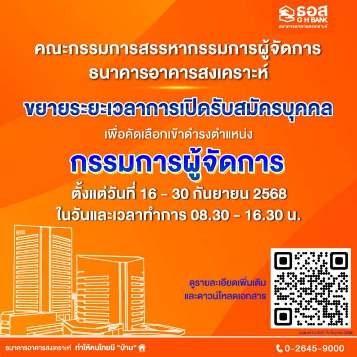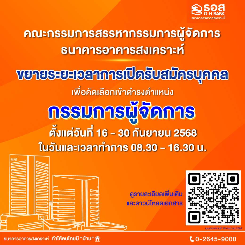 ธอส. ขยายระยะเวลาการเปิดรับสมัครบุคคลเพื่อคัดเลือกเข้าดำรงตำแหน่งกรรมการผู้จัดการธนาคารอาคารสงเคราะห์