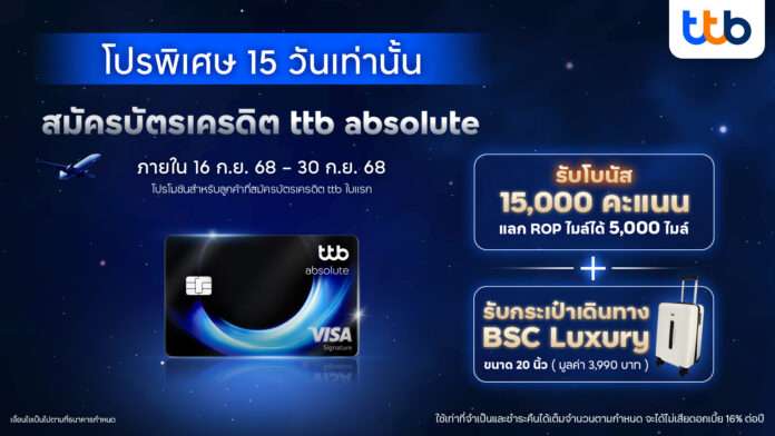 ทีเอ็มบีธนชาต หรือ ทีทีบี มอบโปรโมชันสุดคุ้มแห่งปี พิเศษสำหรับลูกค้าที่สมัครบัตรเครดิต ttb absolute และเป็นลูกค้าบัตรเครดิต ttb ใบแรก โดยสมัครตั้งแต่วันที่ 16 กันยายน 2568 – 30 กันยายน 2568 และมียอดใช้จ่ายสะสม 15,000 บาท ขึ้นไปภายใน 30 วัน นับจากวันที่บัตรได้รับการอนุมัติ พร้อมสมัครและเข้าใช้บริการแอป ttb touch และบริการ e-Statement เพื่อรับสิทธิประโยชน์