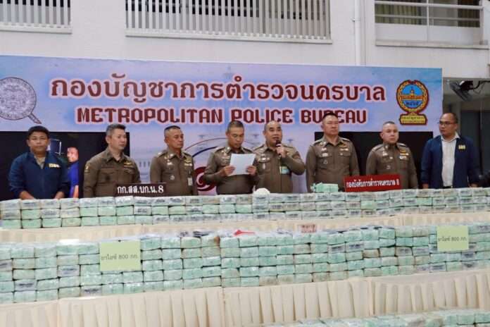 วันนี้ (17 ก.ย.) เมื่อเวลา 13.00 น. ที่กองบัญชาการตำรวจนครบาล (บช.น.) พล.ต.ท.สยาม บุญสม ผบช.น. พล.ต.ต.พัลลภ แอร่มหล้า รอง ผบช.น. พล.ต.ต.มานพ สุคนธ์ธนพัฒน์ รอง ผบช.น. พล.ต.ต.สุรเชษฐ์ บัณฑิตย์ ผบก.น. 8พ.ต.อ.โชติช่วง รัศมี ผกก.สส.บก.น.8 พ.ต.ท.บุญฤทธิ์ เสียงใส พ.ต.ท.อชิรเวชชย์ สุพรรณเภสัช พ.ต.ท.ณรรฐพงษ์ มัคเจริญ รอง ผกก.สส.บก.น.8 พ.ต.ท.นัทธพงศ์ แก้วอยู่ พ.ต.ต.ทรงผล นาคชำนาญ สว.กก.สส.บก.น.8 พร้อมกำลังเจ้าหน้าที่ กก.สส.บก.น.8 ร่วมกันแถลงผลการจับกุม ผู้ต้องหาคดียาเสพติด 3 ราย 1.นายนพดล หรือ เจ ปิ่นแก้ว อายุ 34 ปี 2.นายอังคาร หรือคาร ชิ่นกลิ่น อายุ 36 ปี และ 3. นายสำเริง หรือแจ็ค กันต์สิงห์ อายุ 38 ปี พร้อมด้วยของกลาง ยาไอซ์ จำนวน 800 ห่อ น้ำหนักห่อละประมาณ 1 กิโลกรัม รวมน้ำหนักประมาณ 800 กิโลกรัม, อาวุธปืนขนาด .357 จำนวน 1 กระบอกและเครื่องกระสุน จำนวน 31 นัด, รถยนต์ที่ใช้ซุกซ่อนและรับ-ส่งยาเสพติด จำนวน 3 คัน และทรัพย์อื่น ๆ จำนวนหลายรายการ โดยจับกุมได้ที่บริเวณเพิงพักบ่อปลา ตรงข้าม ซ.บางกระดี่ 43 ถ.บางกระดี่ แขวงแสมดำ เขตบางขุนเทียน กทม.