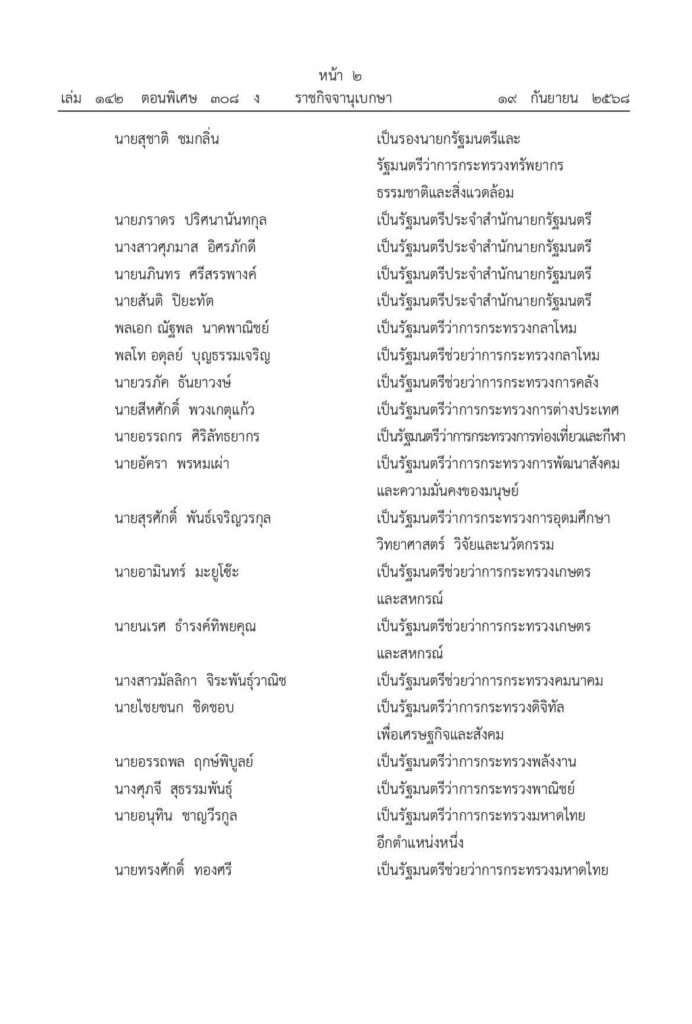 บัดนี้ นายอนุทิน ชาญวีรกูล นายกรัฐมนตรี ได้เลือกสรรผู้ที่สมควรดำรงตำแหน่งรัฐมนตรีเพื่อบริหารราชการแผ่นดินสืบต่อไปแล้ว อาศัยอำนาจตามความในมาตรา 158 ของรัฐธรรมนูญแห่งราชอาณาจักรไทย จึงทรงพระกรุณาโปรดเกล้าฯ แต่งตั้งรัฐมนตรี ดังต่อไปนี้