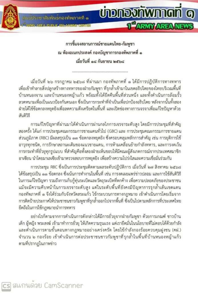จากกรณีเมื่อวันที่ 17 ก.ย. 2568 นาย เพน โบนา โฆษกรัฐบาลกัมพูชา และ พลโทหญิง มาลี โสเจียตา โฆษกกระทรวงกลาโหมกัมพูชา แถลงข่าวประเด็นสถานการณ์ตึงเครียด บ้านหนองหญ้าแก้ว อำเภอโคกสูง จังหวัดสระแก้ว