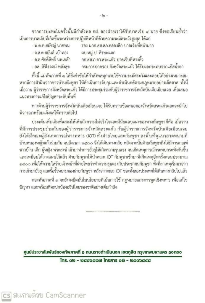 1.กรณีอ้างว่าชาวกัมพูชาเหล่านี้กำลังออกไปปกป้องที่ดินตามกฎหมายของตนจากการถูกละเมิดโดยฝ่ายไทย ขอชี้แจงว่าที่ดินบริเวณพื้นที่ดังกล่าวอยู่ในเขตแดนประเทศไทยอย่างชัดเจน อีกทั้งไม่ได้อยู่ในพื้นที่อ้างสิทธิ์ของกัมพูชาแต่อย่างใด ชาวบ้านกัมพูชากลุ่มดังกล่าวได้เจตนารุกล้ำเข้ามาอยู่อาศัยอย่างผิดกฎหมายในเขตดินแดนของประเทศไทยมาเป็นเวลานาน โดยมีเจ้าหน้าที่ฝ่ายกัมพูชารู้เห็นและทราบมาโดยตลอด ซึ่งฝ่ายไทยได้เคยทำการประท้วงหลายครั้งในทุกระดับ แต่ฝ่ายกัมพูชาเพิกเฉย ไม่ได้มีการแก้ไขปัญหาแต่อย่างใด