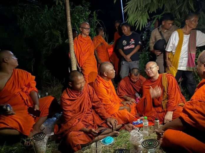 กระทั่งเวลาล่วงเลยถึง 22.00 น. แก๊งดังกล่าวยังคงอยู่ในพื้นที่ โดยไม่ปฏิบัติกิจของสงฆ์ตามธรรมเนียม ขณะที่ “กำนันลี” ได้เกณฑ์ชาวบ้านทั้งชายและหญิงให้มาร่วมปักหลักนอนค้างกับกลุ่มดังกล่าวในพื้นที่ สร้างความเคลื่อนไหวที่ชาวบ้านจับตามองอย่างใกล้ชิด