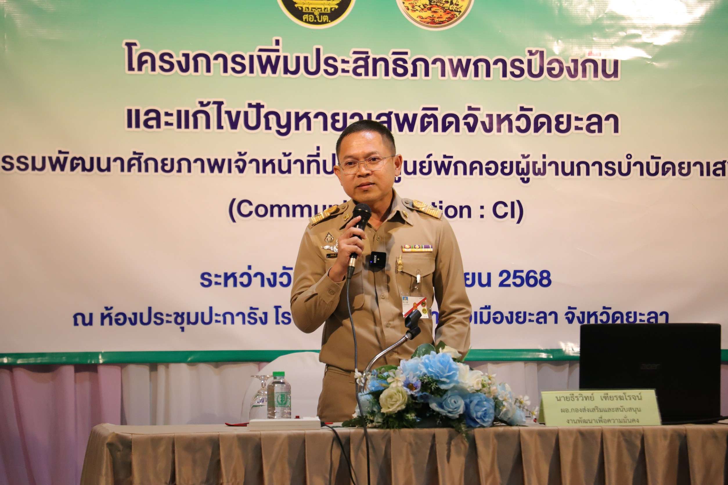 ยะลา, วันที่ 18 กันยายน ศูนย์อำนวยการบริหารจังหวัดชายแดนใต้ (ศอ.บต.) จัดกิจกรรมเพื่อพัฒนาศักยภาพเจ้าหน้าที่ศูนย์พักคอยผู้ผ่านการบำบัดยาเสพติด โดยมี นายธีรวิทย์ เฑียรฆโรจน์ ผู้อำนวยการกองส่งเสริมและสนับสนุนงานพัฒนาเพื่อความมั่นคง ศอ.บต. ร่วมบรรยายในหัวข้อ “บทบาทการป้องกันและแก้ไขปัญหายาเสพติดในจังหวัดชายแดนภาคใต้”