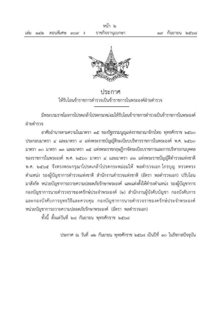 เมื่อวันที่ 19 กันยายน พุทธศักราช 2568 ราชกิจจานุเบกษาได้ประกาศให้รับโอนข้าราชการตำรวจเป็นข้าราชการในพระองค์ฝ่ายตำรวจ มีพระบรมราชโองการโปรดเกล้าโปรดกระหม่อมให้รับโอนข้าราชการตำรวจเป็นข้าราชการในพระองค์ฝ่ายตำรวจ อาศัยอำนาจตามความในมาตรา 15 ของรัฐธรรมนูญแห่งราชอาณาจักรไทย พุทธศักราช 2560 ประกอบมาตรา 4 และมาตรา 9 แห่งพระราชบัญญัติระเบียบบริหารราชการในพระองค์ พ.ศ. 2560 มาตรา 10 มาตรา 13 และมาตรา 15 แห่งพระราชกฤษฎีกาจัดระเบียบราชการและการบริหารงานบุคคลของราชการในพระองค์ พ.ศ. 2560 มาตรา 4 และมาตรา 93 แห่งพระราชบัญญัติตำรวจแห่งชาติ พ.ศ. 2565