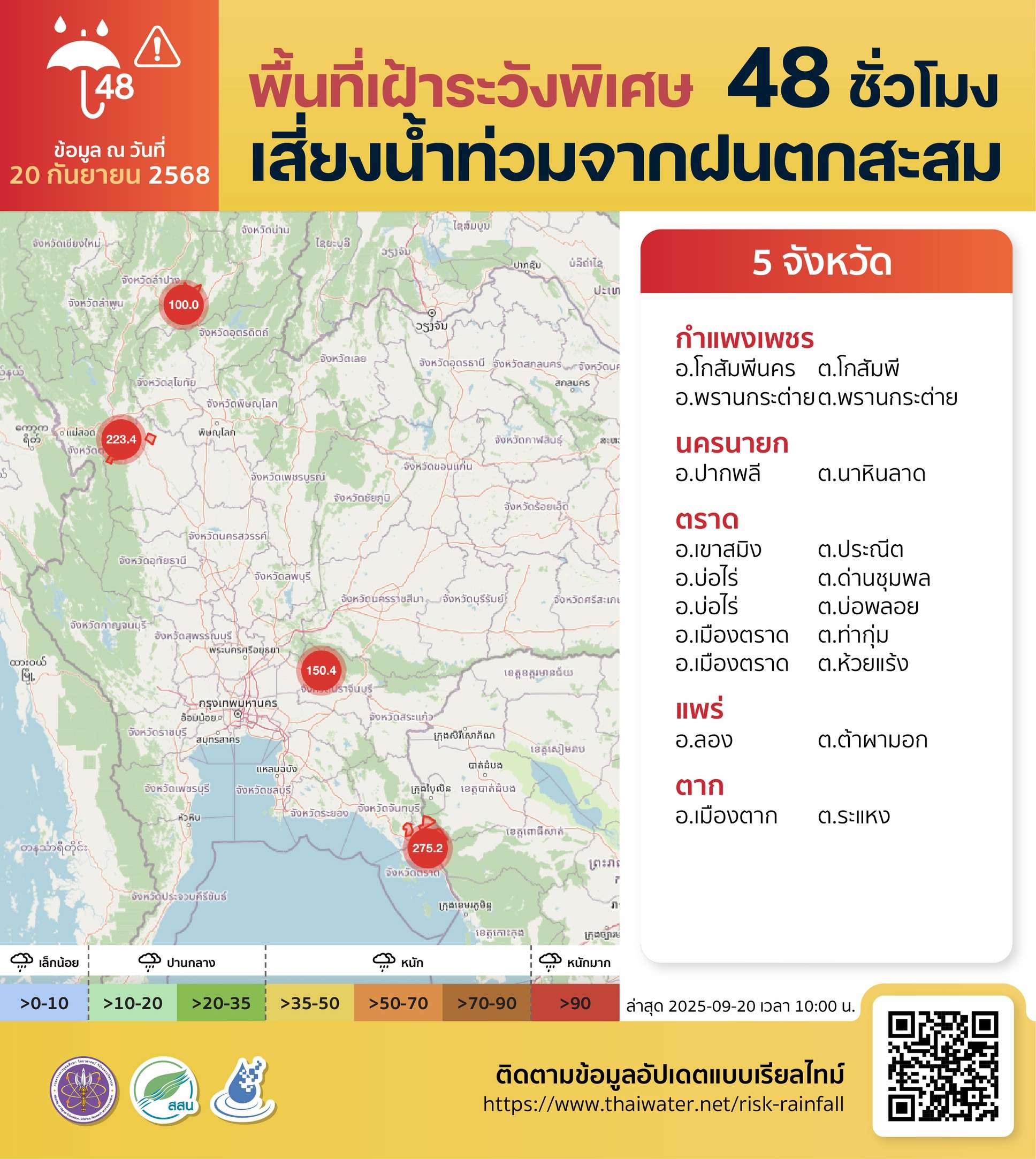เฝ้าระวัง ฝนตกหนักถึงหนักมาก บริเวณภาคเหนือตอนล่าง ภาคกลาง ภาคตะวันออกเฉียงเหนือตอนล่าง ภาคตะวันออก และภาคใต้ อาจทำให้เกิดน้ำท่วมฉับพลันน้ำป่าไหลหลากบริเวณที่ลาดเชิงเขา น้ำท่วมขังในพื้นที่เขตเมือง และน้ำล้นตลิ่ง จากฝนที่ตกสะสม ในช่วงวันที่ 20 – 22 ก.ย. 68