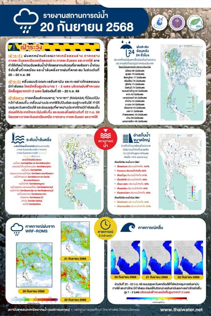 คลังข้อมูลน้ำฯ เตือนอิทธิพลพายุ “รากาซา” ทำร่องมรสุม-ลมตะวันตกเฉียงใต้แรงขึ้น เสี่ยงฝนตกหนัก น้ำท่วมฉับพลัน น้ำป่าไหลหลาก และคลื่นสูงกว่า 2 เมตร ระหว่าง 20–22 ก.ย. นี้ โดยเฉพาะภาคเหนือ อีสาน กลาง ตะวันออก และใต้
