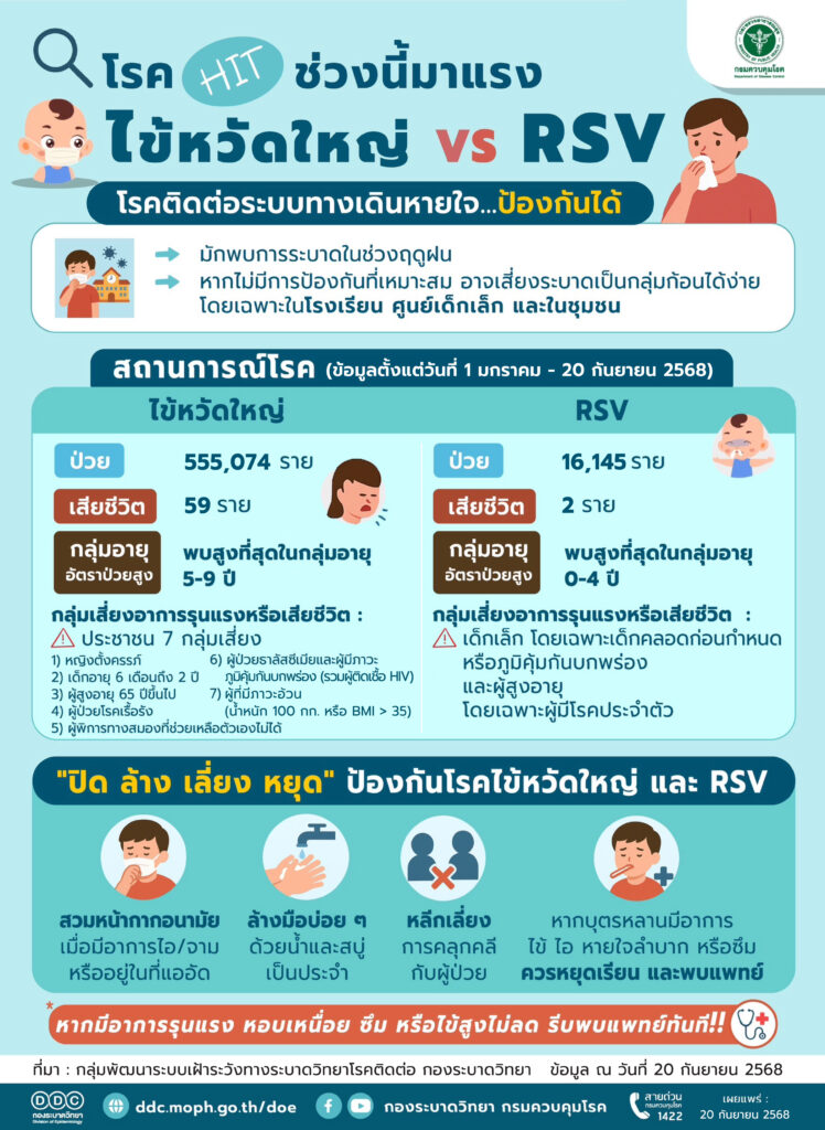 วันนี้ (21 กันยายน 2568) นายแพทย์ภาณุมาศ ญาณเวทย์สกุล อธิบดีกรมควบคุมโรค กล่าวว่า ข้อมูลจากระบบเฝ้าระวังโรคดิจิทัล (DDS) กองระบาดวิทยา พบว่า ในรอบสัปดาห์ที่ผ่านมา (7–13 กันยายน 2568) มีการระบาดของโรคติดต่อระบบทางเดินหายใจเพิ่มสูงขึ้น โดยเฉพาะโรคไข้หวัดใหญ่ และโรคติดเชื้อไวรัสอาร์เอสวี (RSV) ซึ่งมีแนวโน้มพบผู้ป่วยมากขึ้นกว่าสัปดาห์ก่อน โดยมีรายงานผู้ป่วยโรคไข้หวัดใหญ่เพิ่มขึ้น 30,055 ราย และผู้ป่วยโรคติดเชื้อไวรัสอาร์เอสวี (RSV) เพิ่มขึ้น 3,454 ราย สถานการณ์โรคตั้งแต่วันที่ 1 มกราคม–20 กันยายน 2568 พบผู้ป่วยโรคไข้หวัดใหญ่สะสม 555,074 ราย เสียชีวิต 59 ราย กลุ่มอายุที่มีอัตราป่วยต่อประชากรแสนคนสูงสุด 3 อันดับแรก คือ กลุ่มอายุ 5–9 ปี (2,874.80) รองลงมาเป็น 0–4 ปี (2,395.00) และ 10–14 ปี (1,959.10) ตามลำดับ ส่วนโรคติดเชื้อไวรัสอาร์เอสวี (RSV) พบผู้ป่วยสะสม 16,145 ราย เสียชีวิต 2 ราย กลุ่มอายุที่มีอัตราป่วยต่อประชากรแสนคนสูงสุด คือ 0–4 ปี (467.10) รองลงมาเป็นกลุ่มอายุ 5–9 ปี (48.90) และ 10–14 ปี (4.20) ตามลำดับ