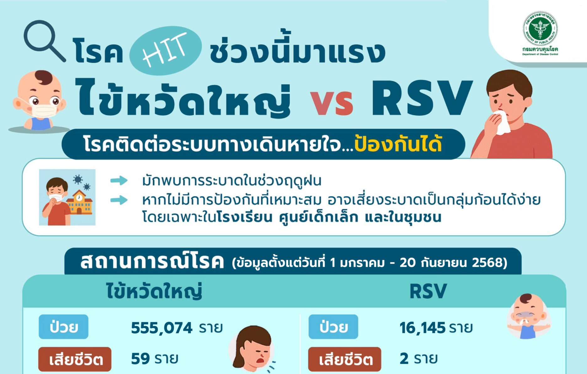 กรมควบคุมโรค กระทรวงสาธารณสุข ย้ำเตือนช่วงฤดูฝน ประชาชนยังไม่ควร “ปล่อยการ์ดตก” เนื่องจากพบผู้ป่วยโรคติดต่อระบบทางเดินหายใจเพิ่มสูงขึ้นกว่าสัปดาห์ก่อน ทั้งโรคไข้หวัดใหญ่ และโรคติดเชื้อไวรัสอาร์เอสวี (Respiratory Syncytial Virus; RSV) ขอประชาชนยึดหลัก “ปิด ล้าง เลี่ยง หยุด” และรักษาสุขอนามัยส่วนบุคคลสามารถป้องกันโรคติดต่อระบบทางเดินหายใจได้