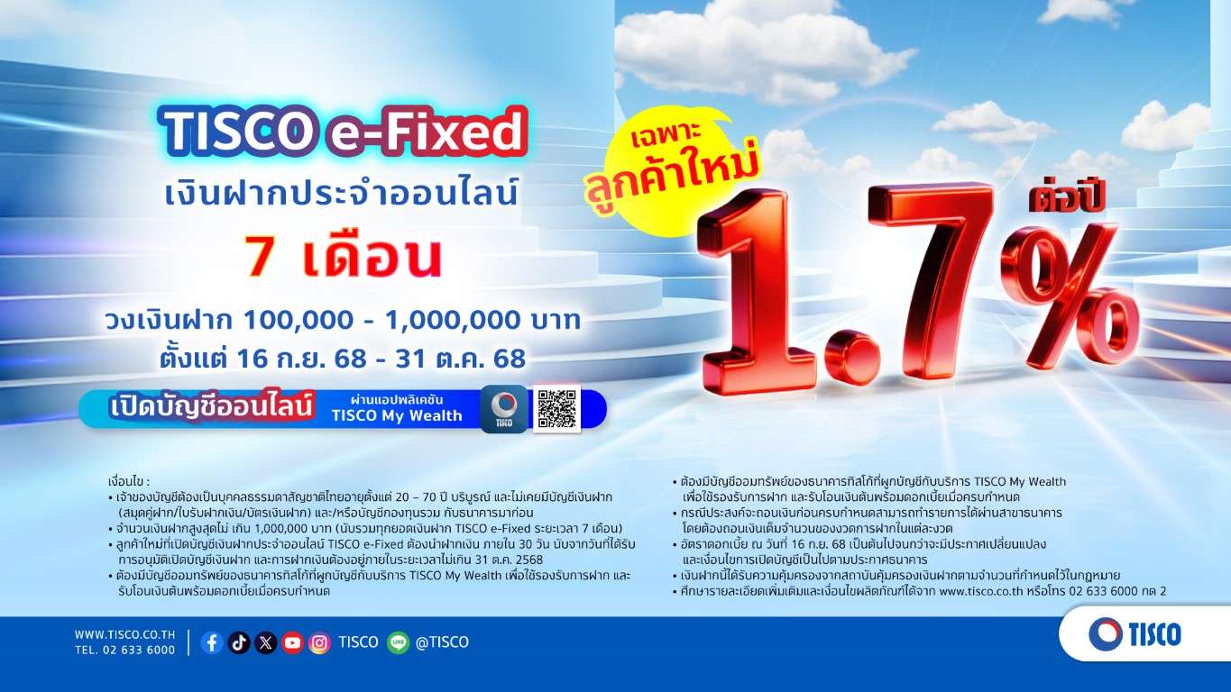 ธนาคารทิสโก้ จำกัด (มหาชน) ชูเงินฝากประจำออนไลน์ดอกเบี้ยสูง “TISCO e-Fixed” เงินฝากประจำ 7 เดือน อัตราดอกเบี้ย 1.7% ต่อปี วงเงินฝาก 100,000 – 1,000,000 บาท เฉพาะลูกค้าใหม่ที่เปิดบัญชีตั้งแต่ 16 กันยายน-31 ตุลาคม 2568 รายละเอียด คลิกhttps://link.tisco.co.th/cpGinS เปิดบัญชีออนไลน์ได้เลยผ่านแอปพลิเคชัน TISCO My Wealth คลิก https://link.tisco.co.th/cqm0Gx