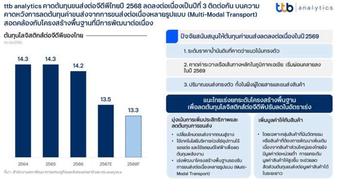 รวมถึงในปี 2569 มุมมองของ ttb analytics คาดแนวโน้มต้นทุนโลจิสติกส์ต่อจีดีพีของไทยมีโอกาสปรับลดลงใกล้ระดับ 13.0% จากแนวโน้มราคาน้ำมันดิบเฉลี่ยในปีหน้าคาดว่าจะอยู่ในระดับใกล้เคียงกับปีนี้ แนวโน้มค่าระวางเรือที่คาดผ่อนคลายลงโดยเฉพาะเส้นทางเอเชียที่ปรับเพิ่มสูงไปแล้วในปี 2568 สถานการณ์การขนส่งทางอากาศที่คาดว่ายังฟื้นตัวได้ต่ำจากภาคท่องเที่ยว ตามทิศทางเศรษฐกิจโลกที่คาดว่าจะเติบโตในอัตราที่ชะลอตัวลง ส่งผลให้สถานการณ์ภาคการค้าที่มีความสัมพันธ์กับการขนส่งทางบกอาจปรับเพิ่มขึ้นไม่มากนัก
