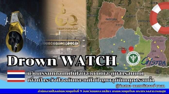 สำนักงานป้องกันควบคุมโรคที่ 9 จังหวัดนครราชสีมา ร่วมกับสำนักงานพัฒนาเทคโนโลยีอวกาศและภูมิสารสนเทศ (GISTDA) พัฒนานวัตกรรม Drown WATCH ผลงานวิชาการดีเด่น Service Plan Sharing 2025 เขตสุขภาพที่ 9 ใช้เทคโนโลยีอวกาศและภูมิสารสนเทศ วิเคราะห์พื้นที่แจ้งเตือนความเสี่ยง และใช้กลไกชุมชน ติดตั้งป้ายแจ้งเตือน จัดอุปกรณ์ช่วยชีวิตในแหล่งน้ำเสี่ยง พร้อมเฝ้าระวังเพื่อช่วยเหลือให้ทันในช่วง Golden Hour ส่งผลให้อัตราการเสียชีวิตจากการจมน้ำลดลงจากร้อยละ 100 เหลือร้อยละ 57.1