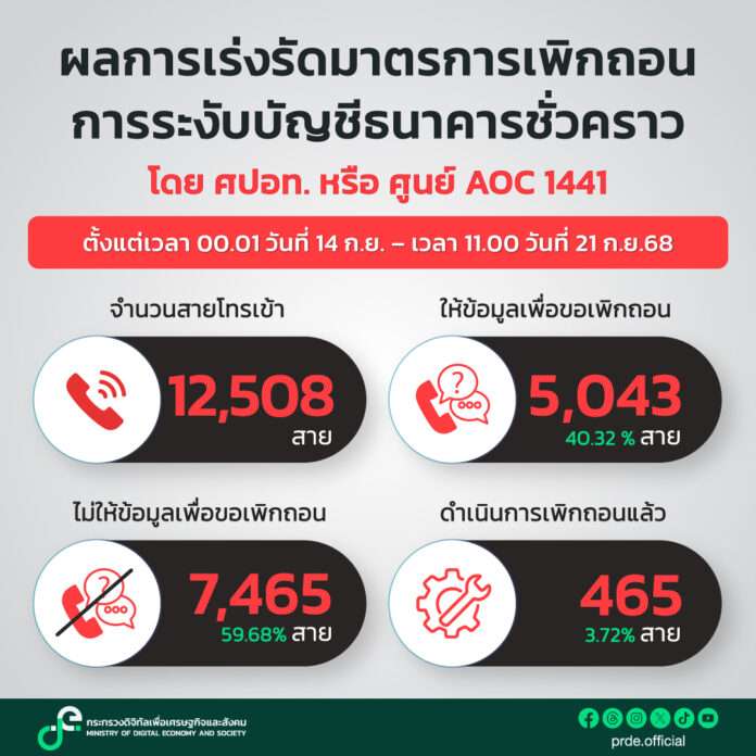 กรุงเทพฯ, วันที่ 21 ก.ย. – กระทรวงดิจิทัลเพื่อเศรษฐกิจและสังคม (ดีอี) เผยผลการเร่งรัดมาตรการ เพิกถอนการระงับบัญชีธนาคารชั่วคราว โดย ศูนย์ปฏิบัติการเพื่อป้องกันและปราบปรามอาชญากรรมทางเทคโนโลยี (ศปอท.) หรือ ศูนย์ AOC 1441 ตั้งแต่เวลา 00.01 วันที่ 14 ก.ย. – เวลา 11.00 วันที่ 21 ก.ย.68 ว่ามีผู้โทรเข้า 1441 กด 2 : 12,508 สาย ในจำนวนนี้ไม่ให้ข้อมูลเพื่อขอเพิกถอน : 7,465 สาย : 59.68% ให้ข้อมูลเพื่อเพิกถอน : 5,043 สาย : 40.32 % ซึ่งทางศูนย์ได้ดำเนินการเพิกถอนแล้ว : 465 บัญชี : 3.72%