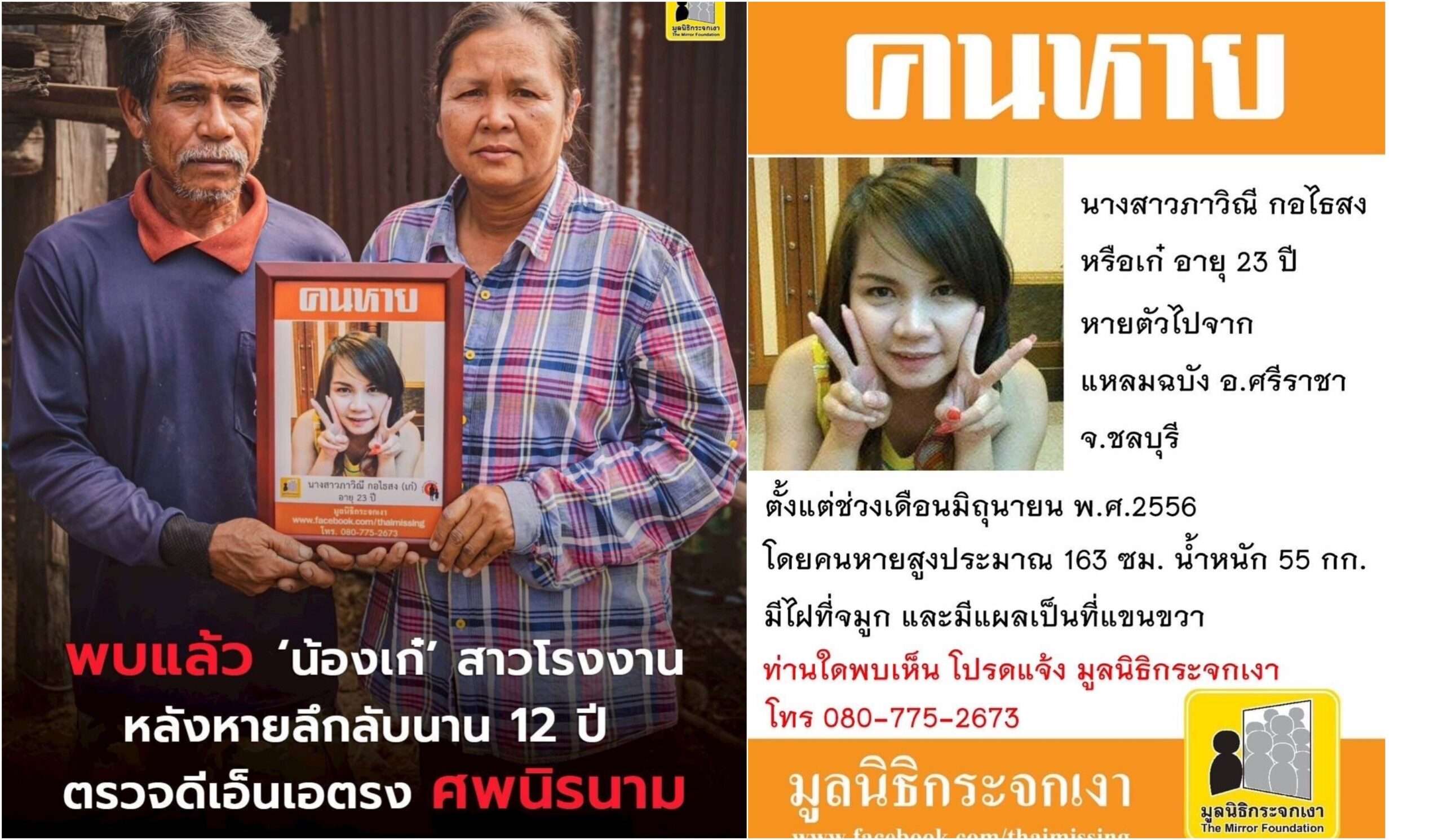 เรื่องราวที่เคยเป็นปริศนามานานกว่า 12 ปี กำลังจะถูกเปิดเผย เมื่อ มูลนิธิกระจกเงา ยืนยันว่า “น้องเก๋” หรือ น.ส.ภาวิณี กอไธสง อายุ 23 ปี หญิงสาวโรงงานที่เคยหายตัวไปอย่างลึกลับเมื่อปี 2556 คือเจ้าของโครงกระดูกนิรนามที่ถูกพบกลางป่าละเมาะ ย่านลาดกระบัง กรุงเทพฯ เมื่อปี 2557