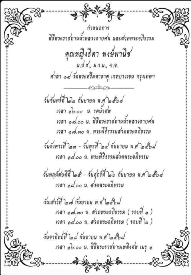 อย่างไรก็ตาม คุณหญิงธิดา พงษ์พานิช เป็นภรรยาของ “มนตรี พงษ์พานิช” อดีตรองนายกรัฐมนตรีและรัฐมนตรีว่าการหลายกระทรวง ซึ่งได้เสียชีวิตอย่างสงบเมื่อวันที่ 12 มิ.ย. 2543 โดยกำหนดการสวดพระอภิธรรม คุณหญิงธิดา พงษ์พานิช ดังนี้